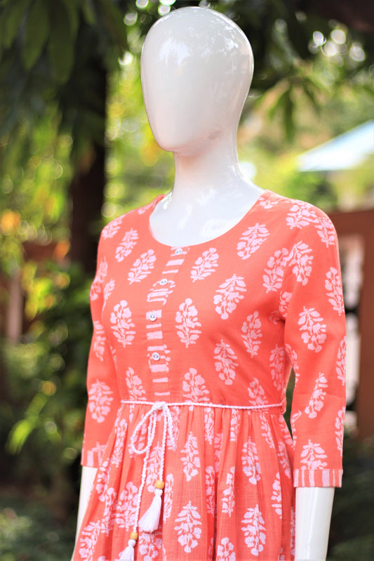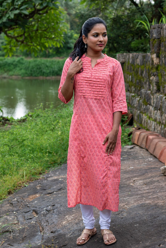 Peach Block Printed Pintuck Kurta