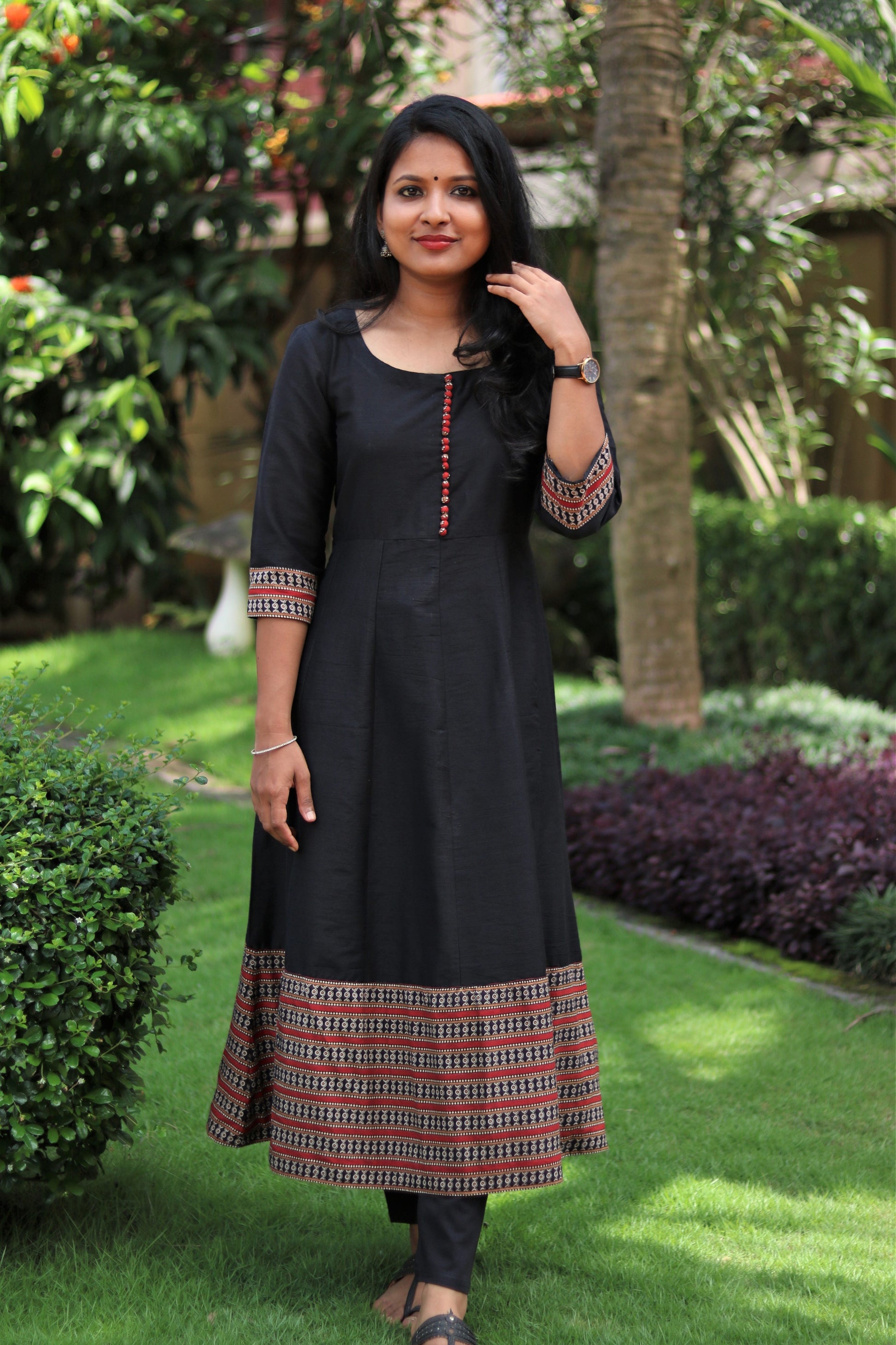 Black & red Paneled Anarkali with Wide Kalamkari Border. Can be used as a Kurta or Dress.