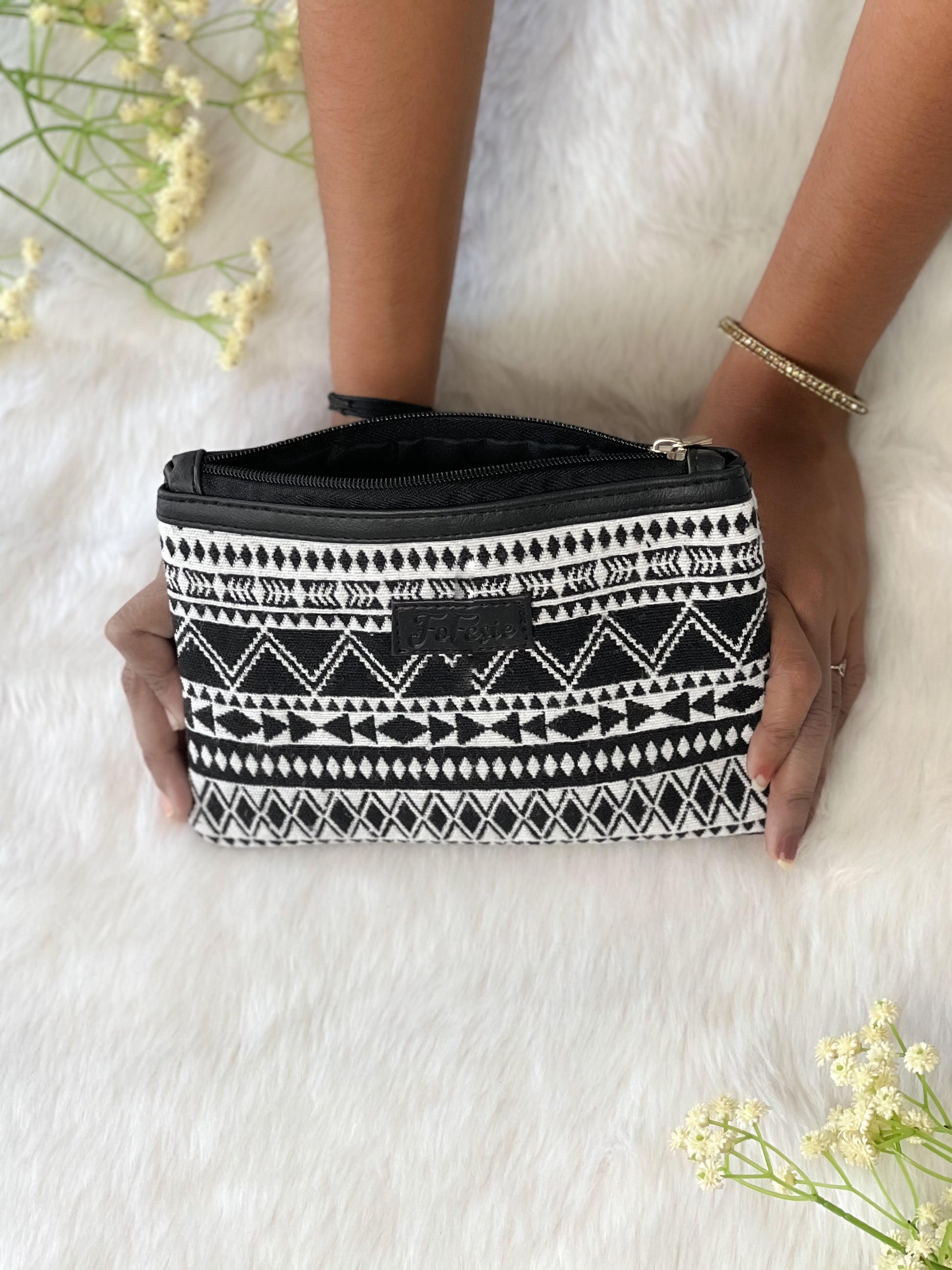 Introducing our sleek & compact utility pouch – handcrafted with luxurious premium cotton jacquard and vegan leather, this stylish pouch blends elegance with practicality. Perfectly designed for everyday use, it features organized compartments to store your makeup, jewellery, and other essentials, keeping them secure and easy to access. A chic accessory that’s as functional as it is beautiful.