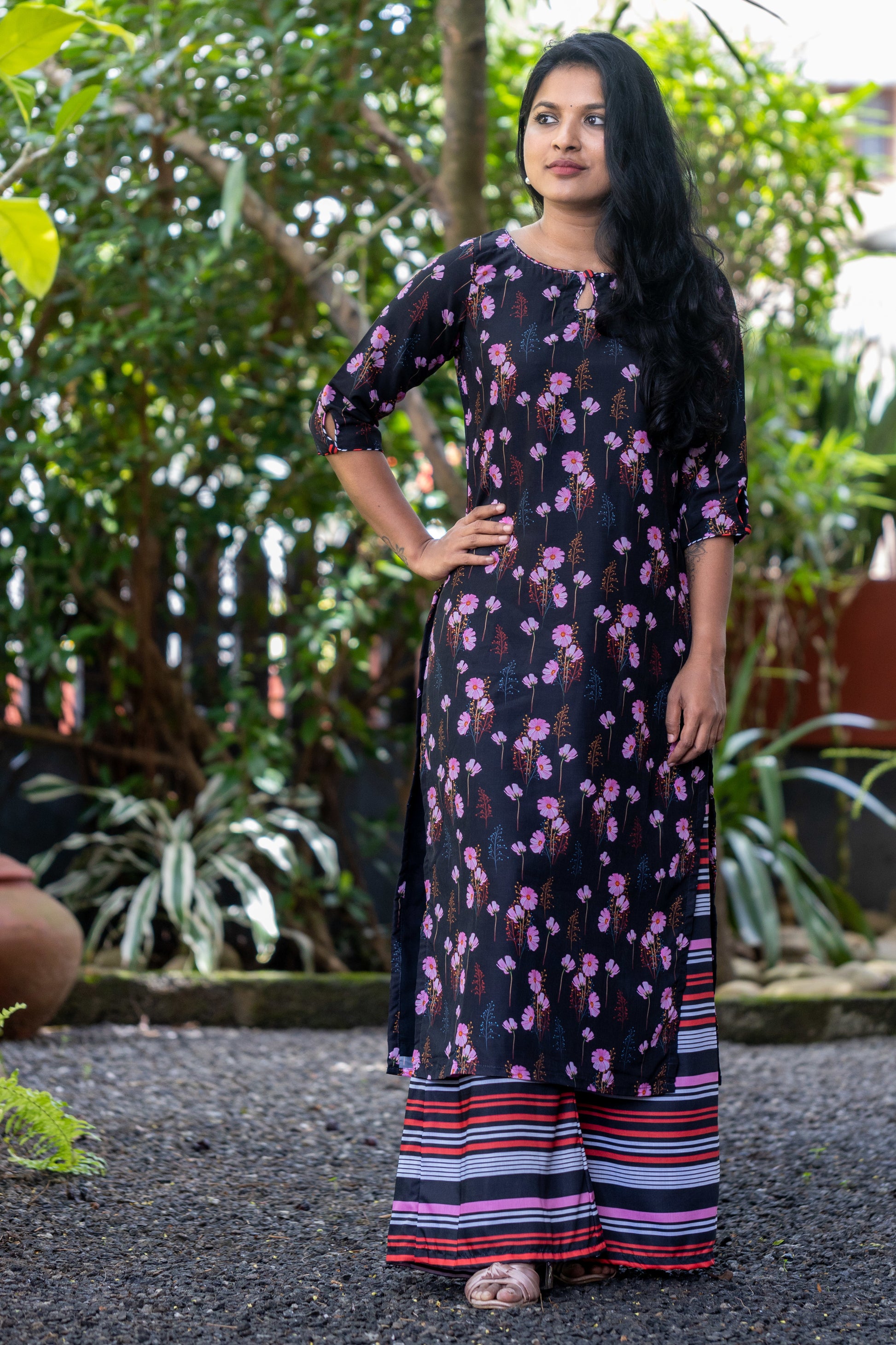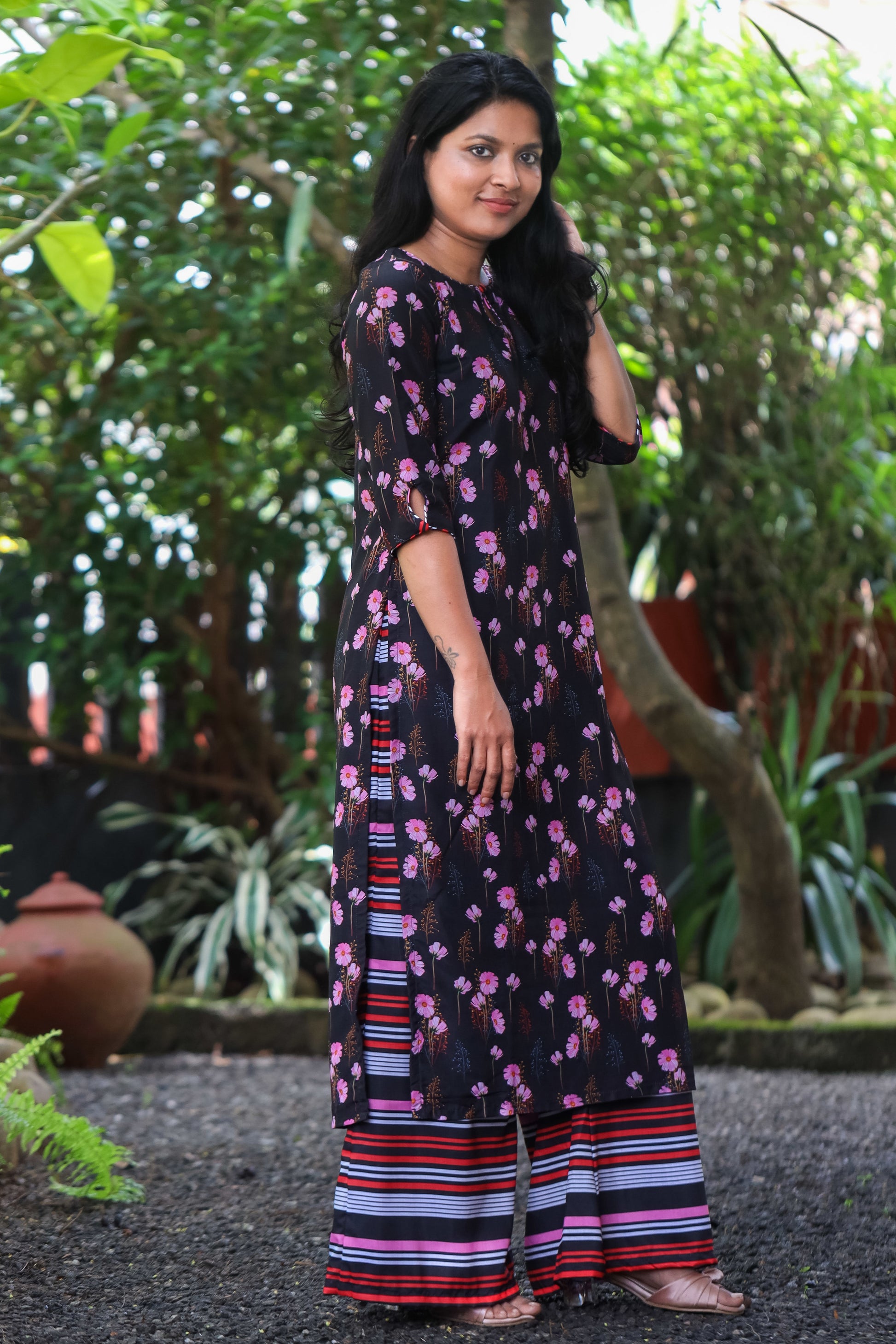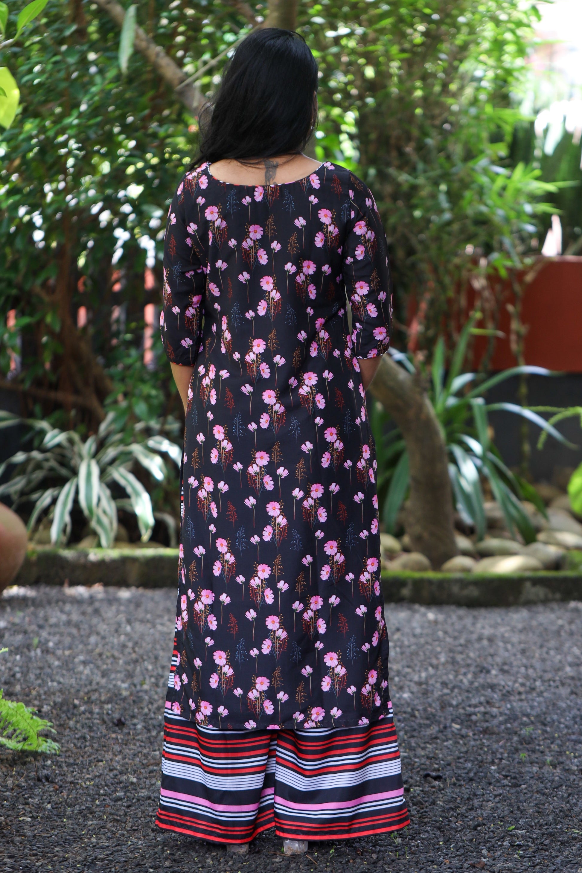 Black & Pink Floral Muslin Kurta with Striped Palazzo Pants