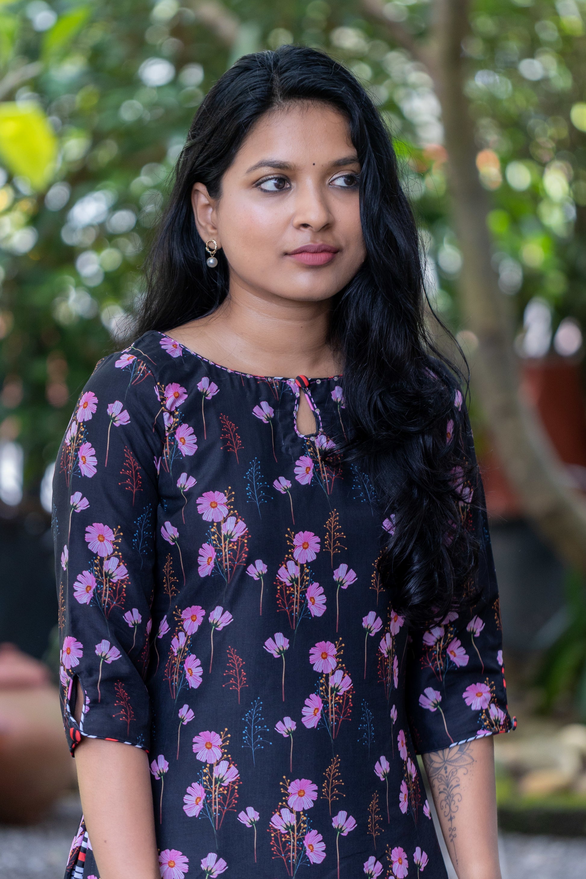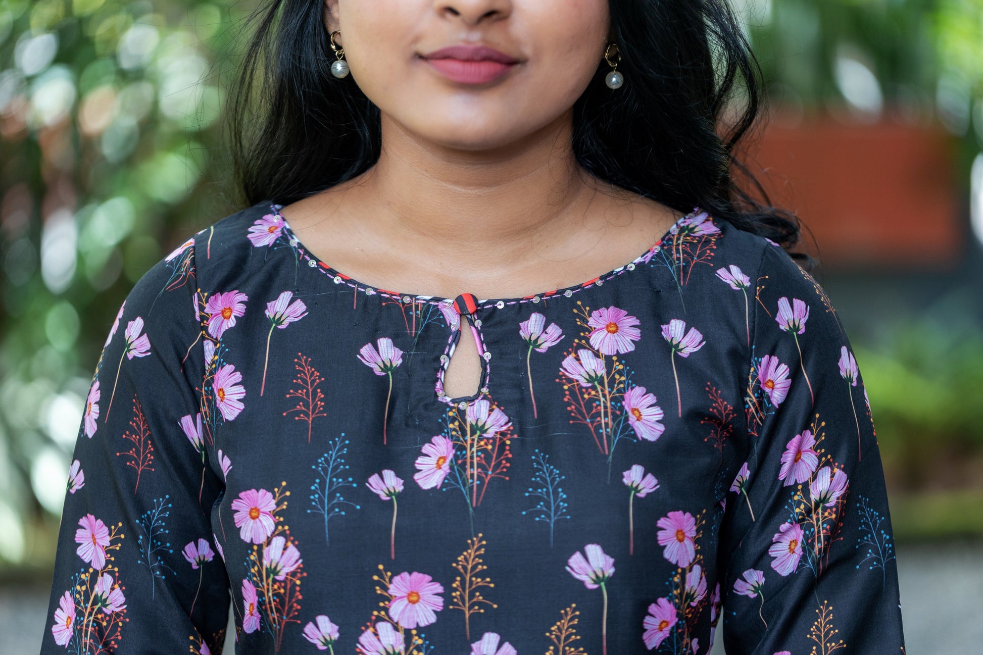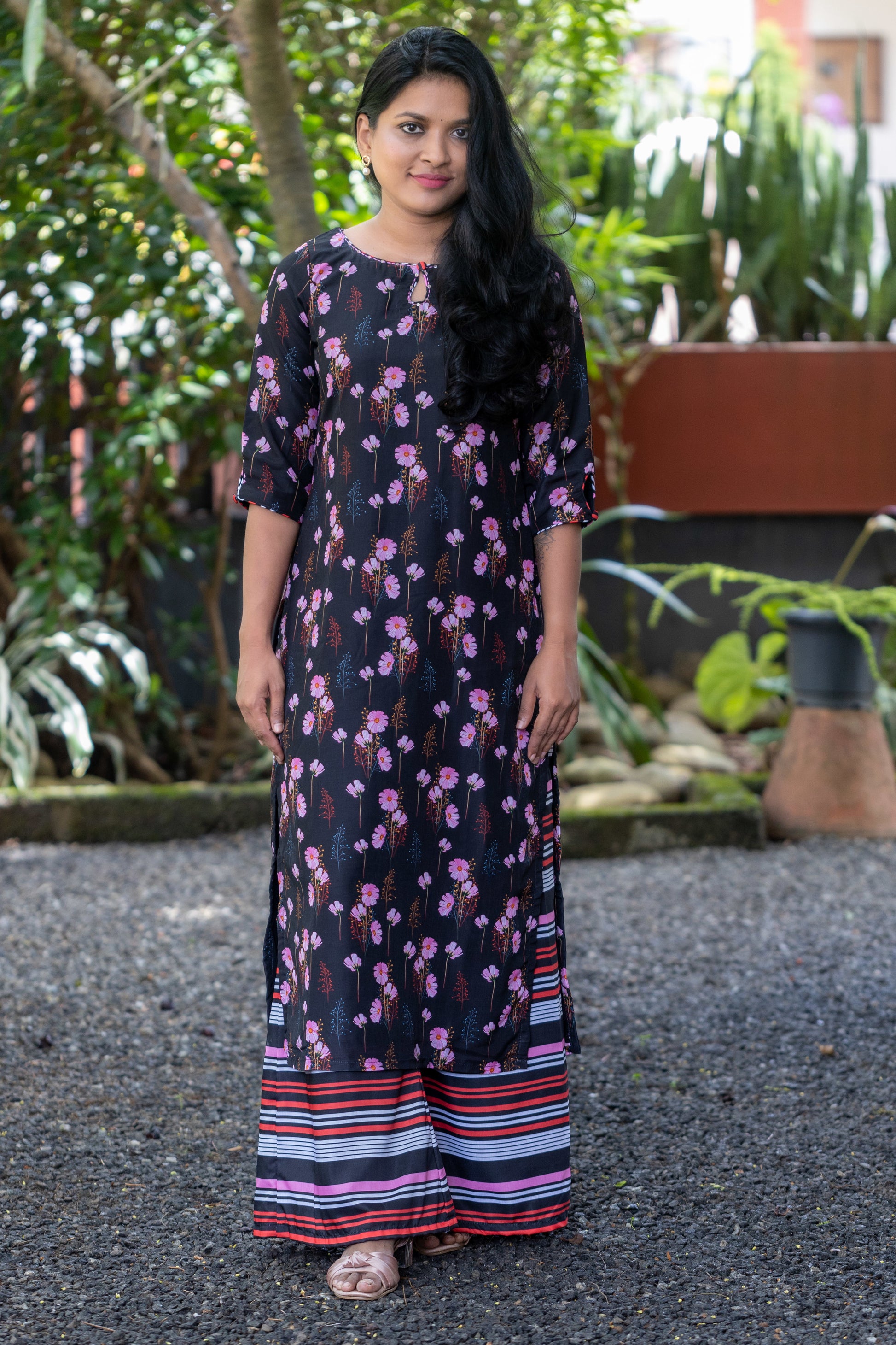 Black & Pink Floral Muslin Kurta with Striped Palazzo Pants