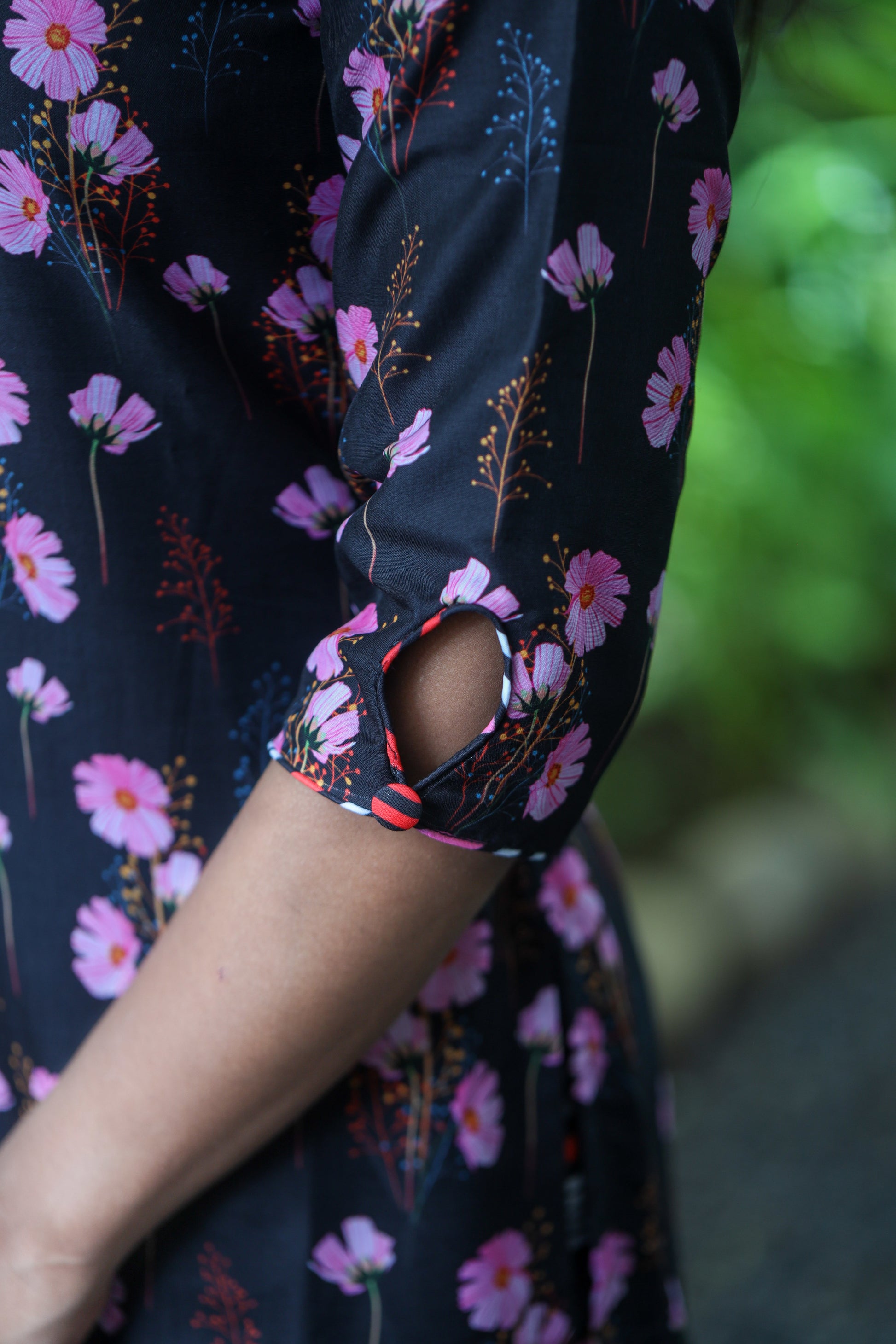 Black & Pink Straight Cut Kurta with sequins work on the neck line and flared palazzo pants. Neck & Sleeves have a loop & button style. Both the Kurta & Palazzo come with Crepe lining ensuring a lustrous fall for the attire!