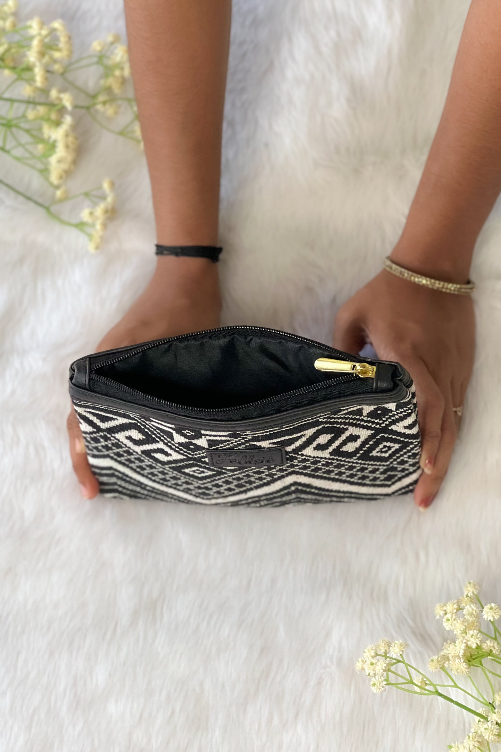 Introducing our sleek & compact utility pouch – handcrafted with luxurious premium cotton jacquard and vegan leather, this stylish pouch blends elegance with practicality. Perfectly designed for everyday use, it features organized compartments to store your makeup, jewellery, and other essentials, keeping them secure and easy to access. A chic accessory that’s as functional as it is beautiful.