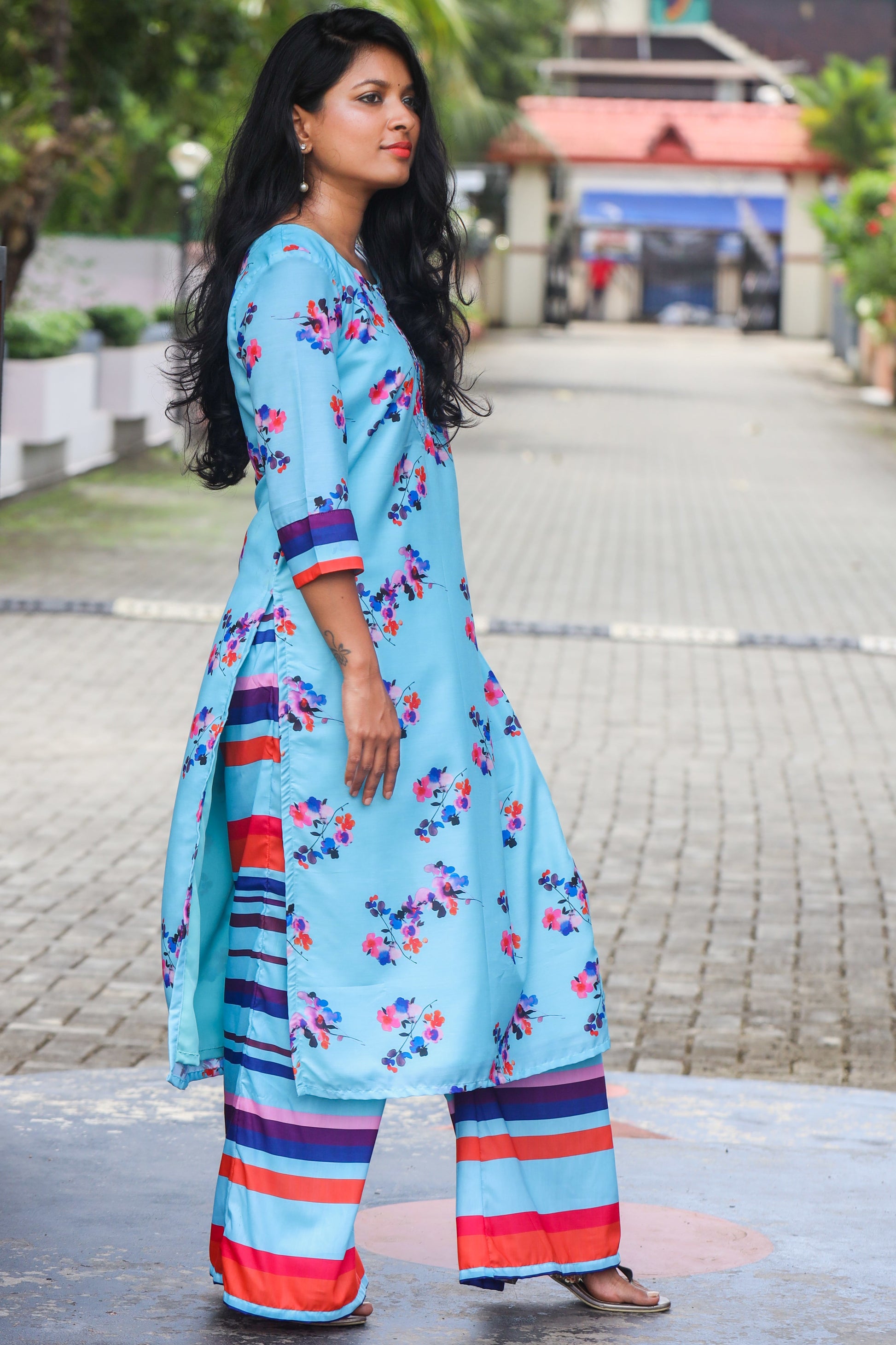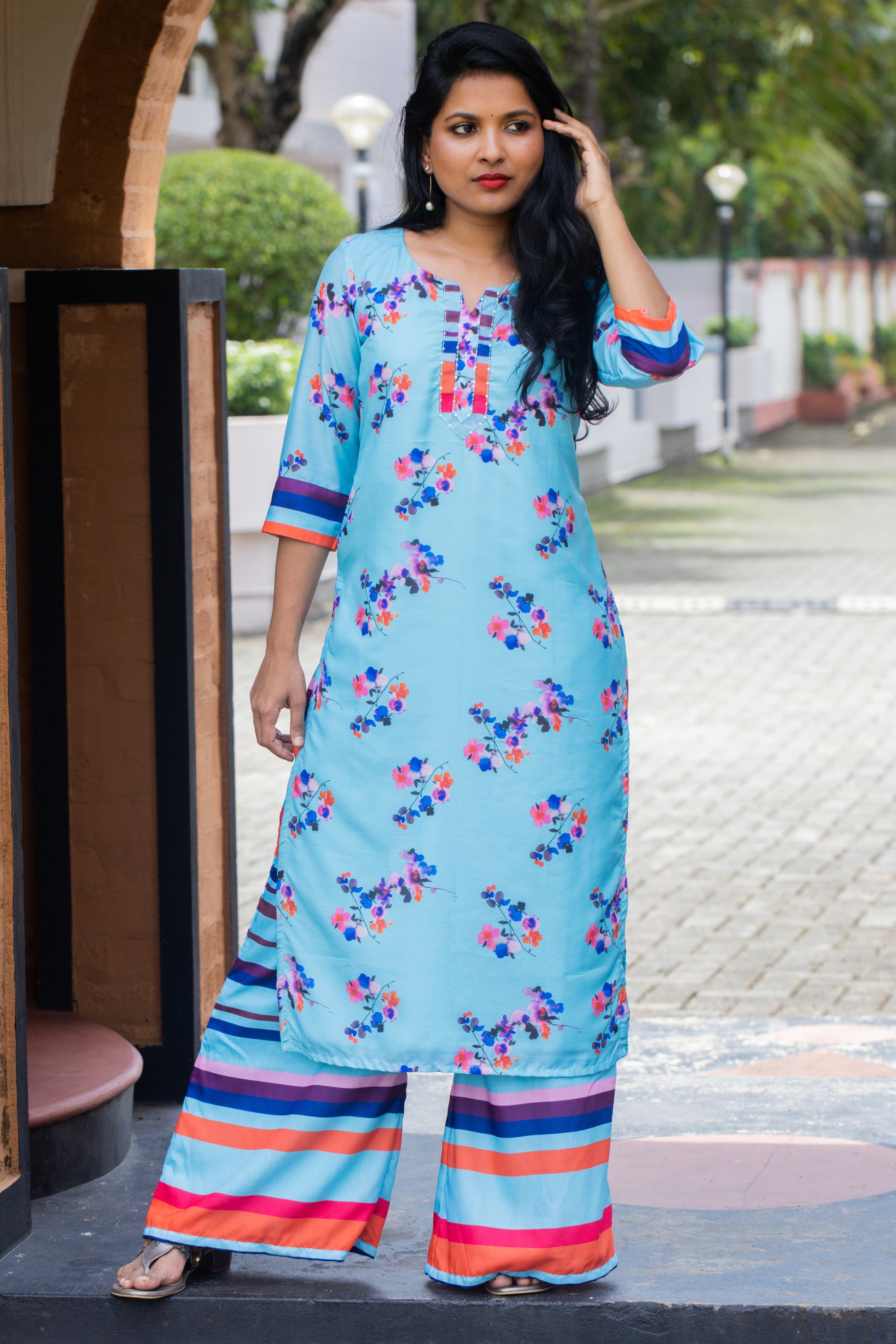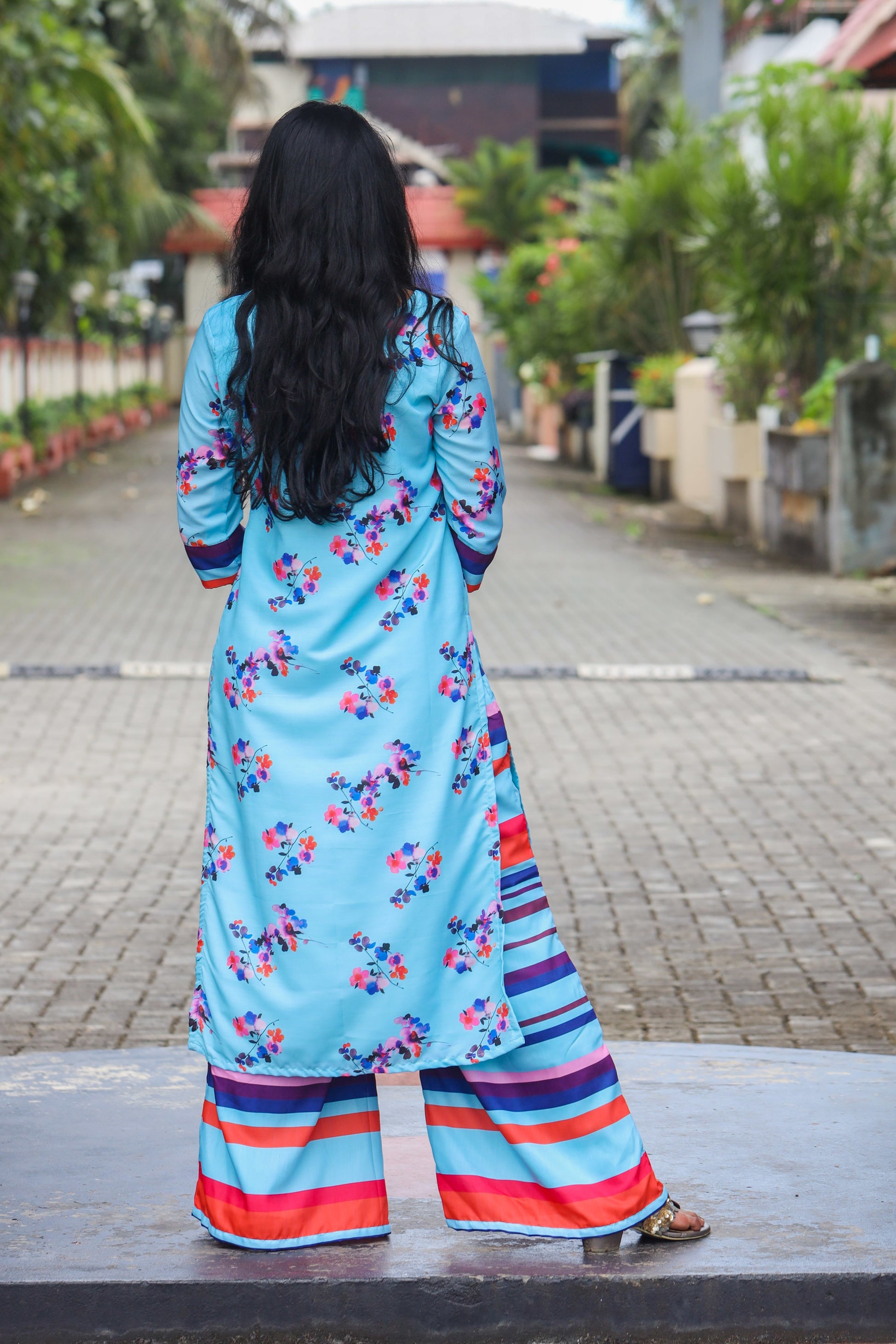 Blue with a combination of shades of red with floral prints Straight Cut Kurta with sequins work on the neck line and flared palazzo pants. Both the Kurta & Palazzo come with Crepe lining ensuring a lustrous fall for the attire!