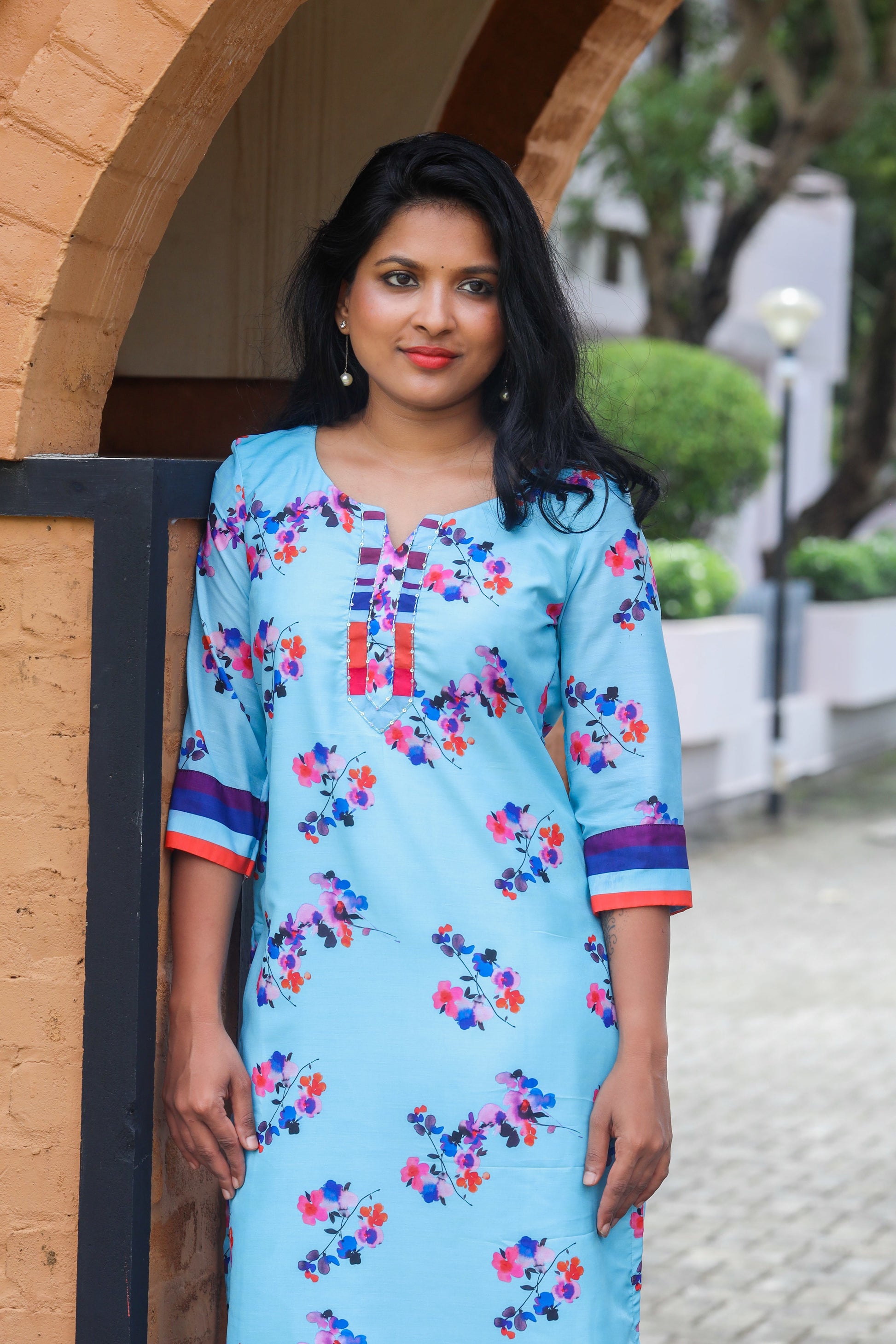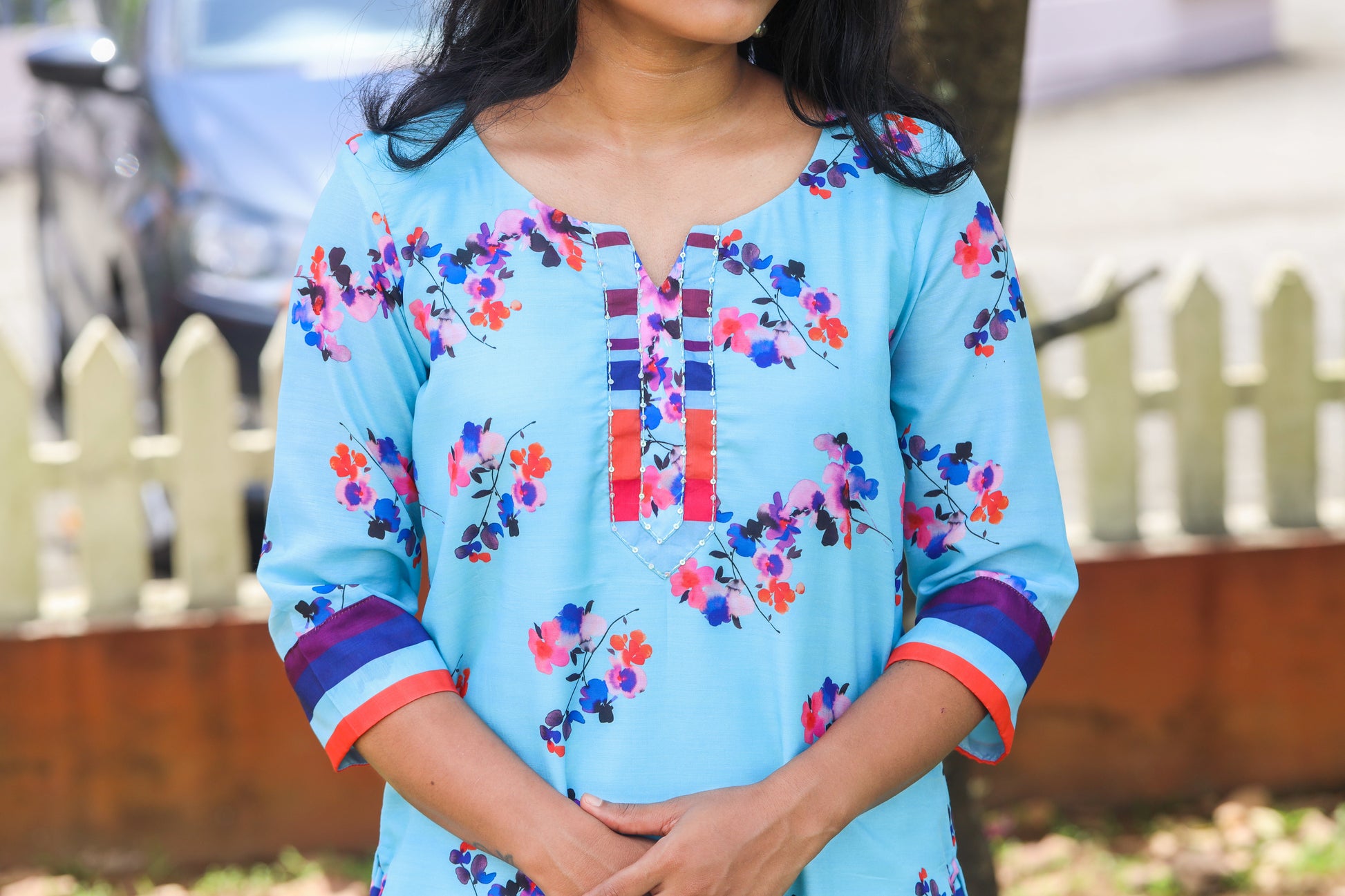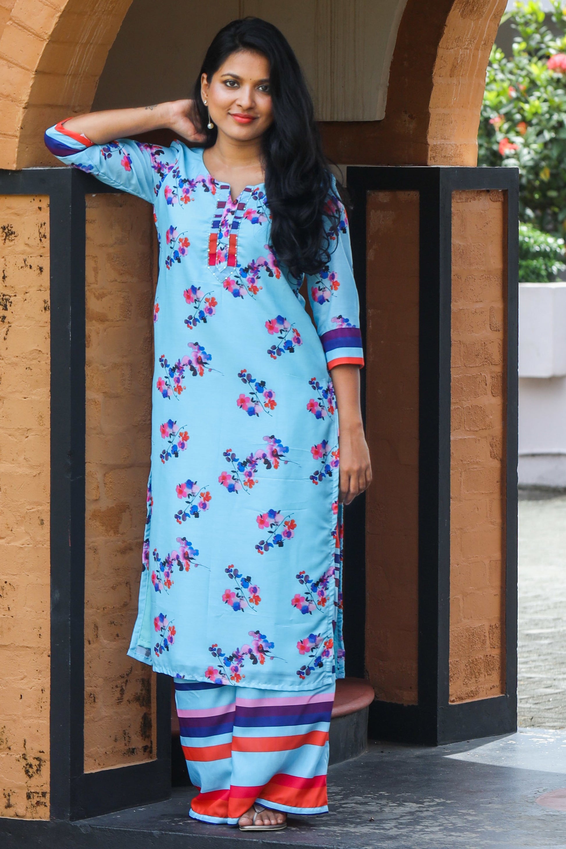 Blue with a combination of shades of red with floral prints Straight Cut Kurta with sequins work on the neck line and flared palazzo pants. Both the Kurta & Palazzo come with Crepe lining ensuring a lustrous fall for the attire!