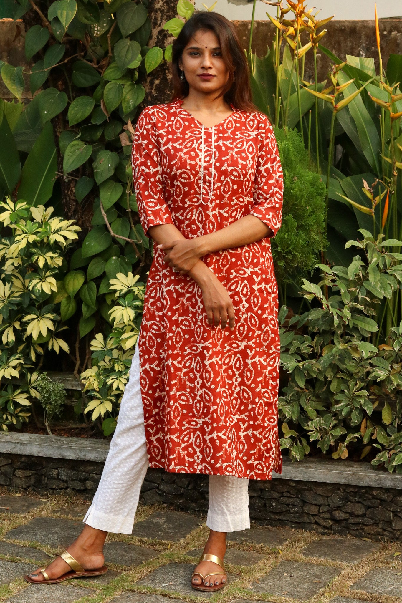 This Brick Brown Batik Kurta is a casual, comfortable and versatile piece of clothing. A perfect blend of cotton fabric and batik print make it ideal for regular office wear or day-to-day styling. Its breathable and comfortable texture will provide excellent fit, tailored to your unique shape.