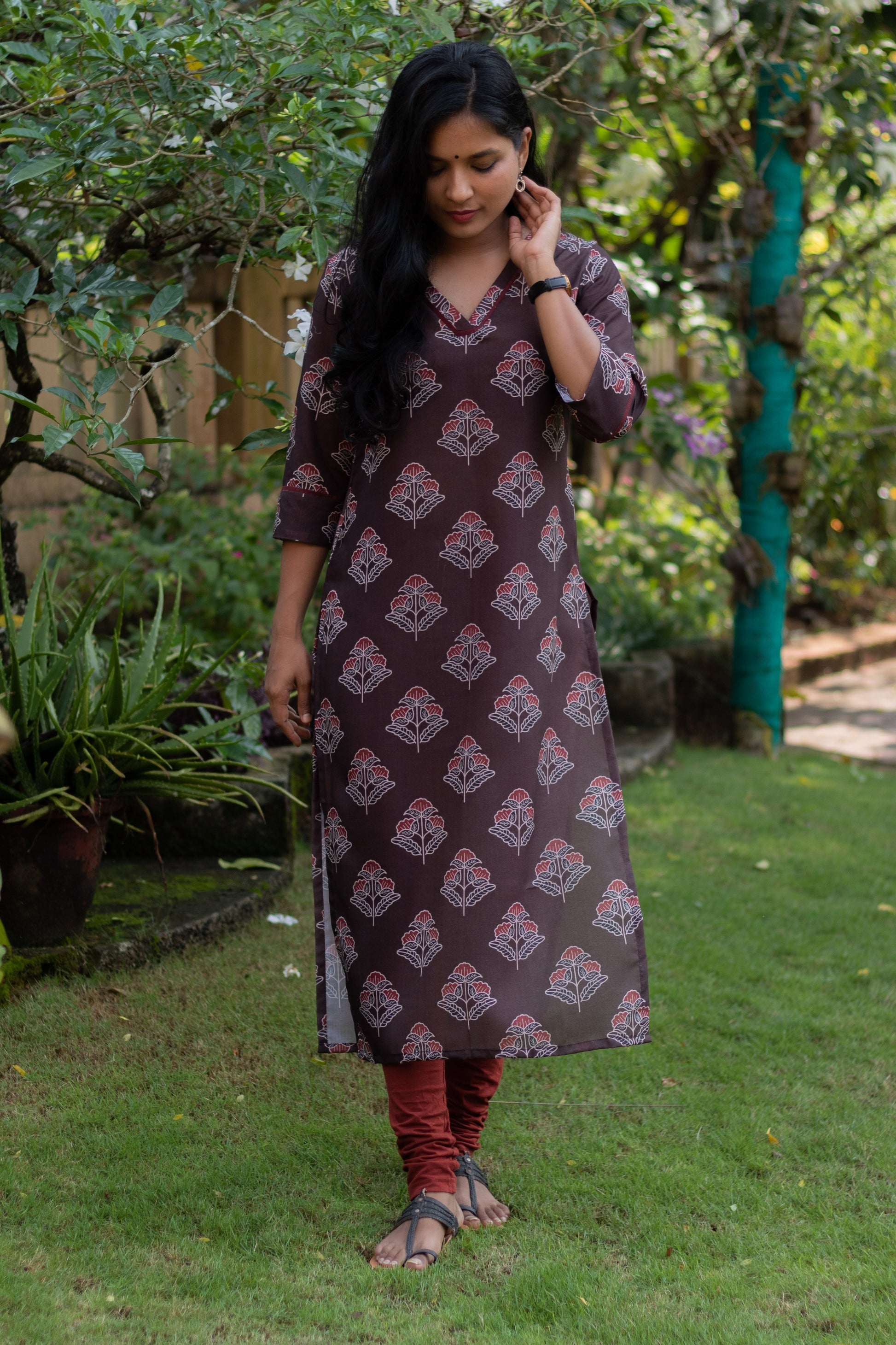 V neck coffee brown straight cut kurta with maroon piping on neck & sleeves