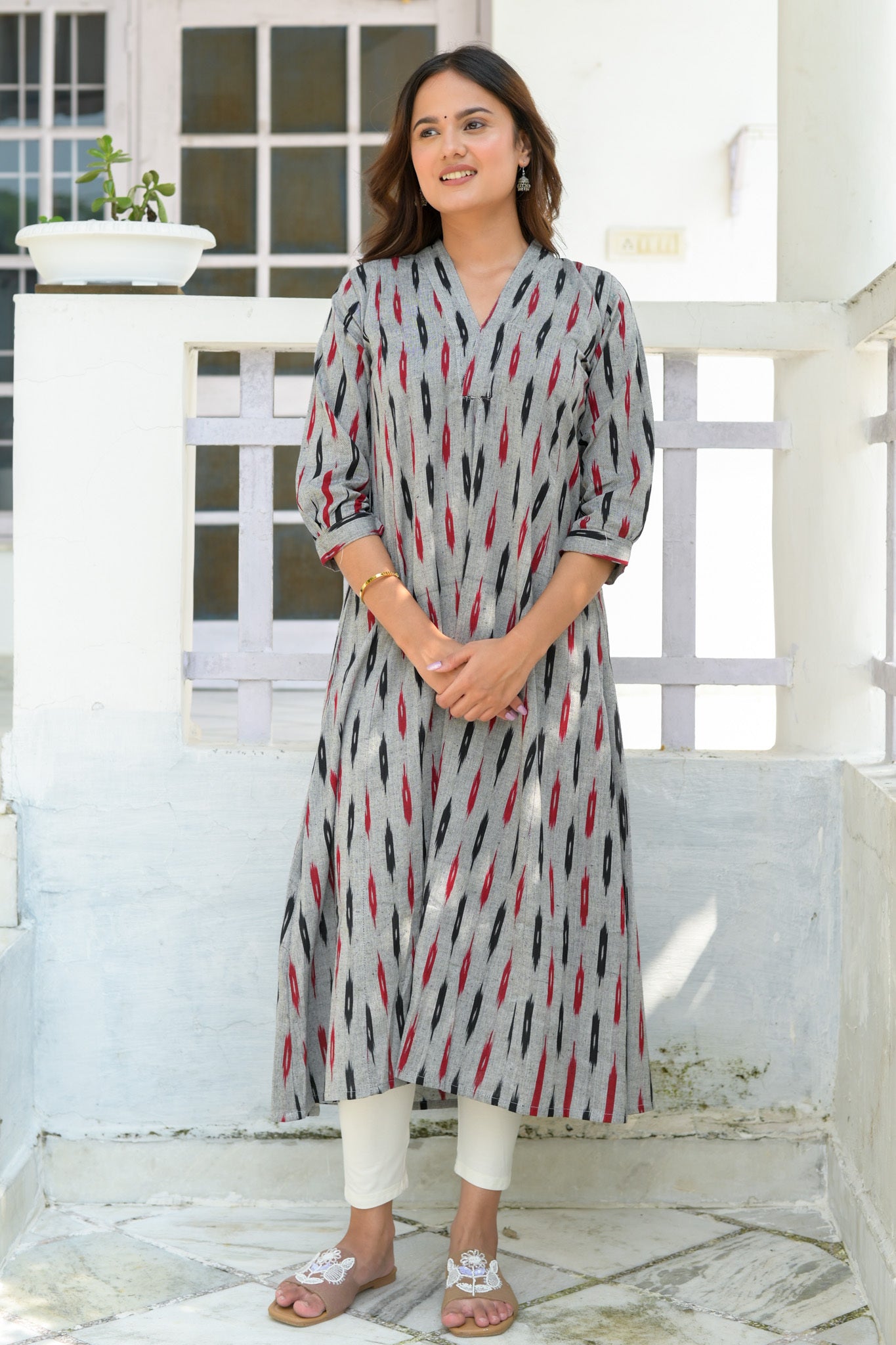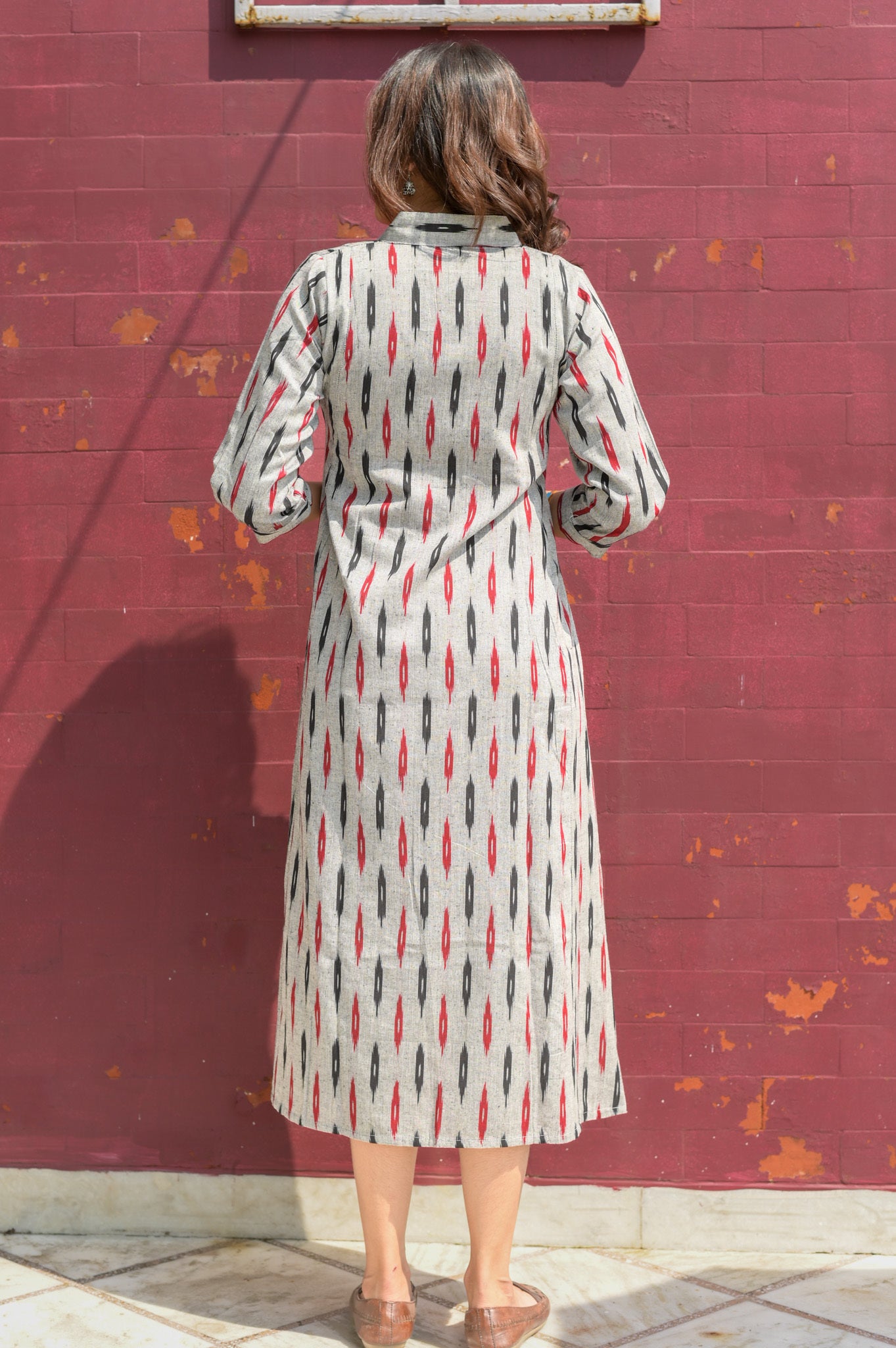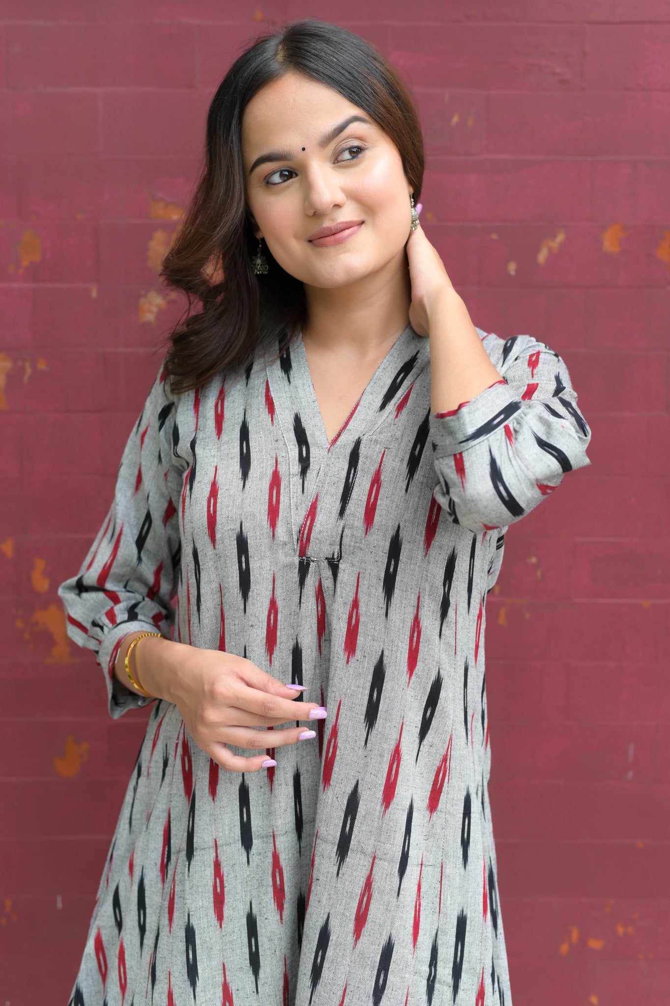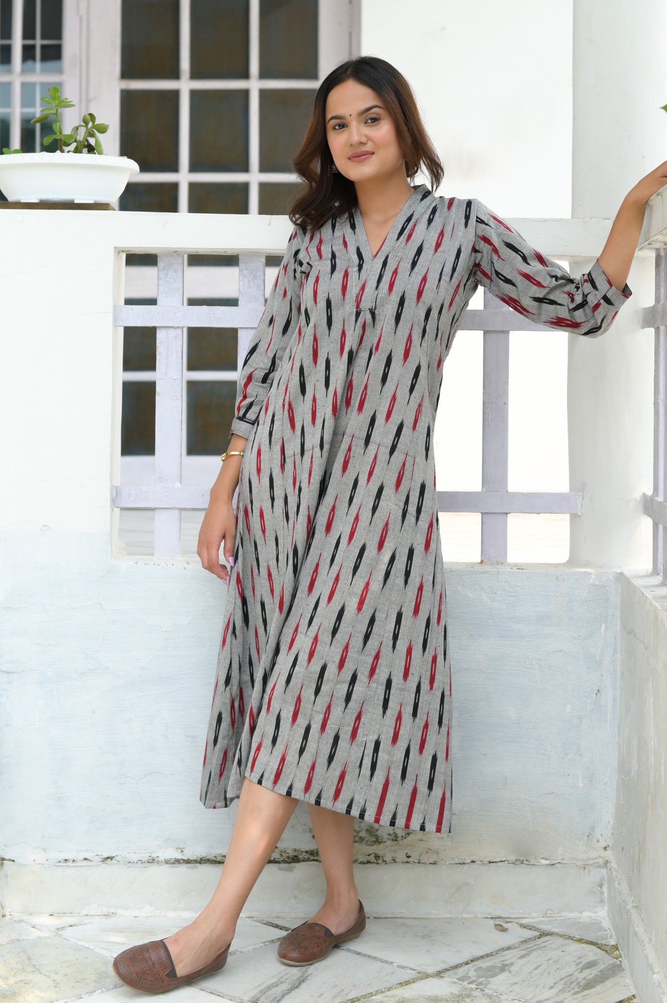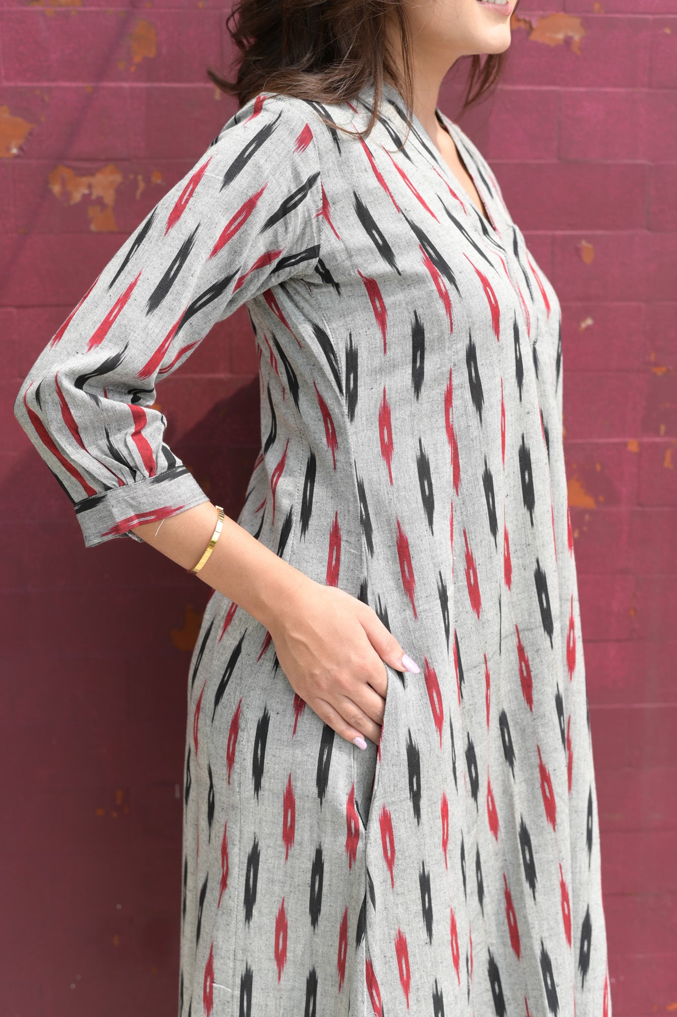 Classic Black & Red Ikat Print in a Grey Cotton A Line Dress with pockets.