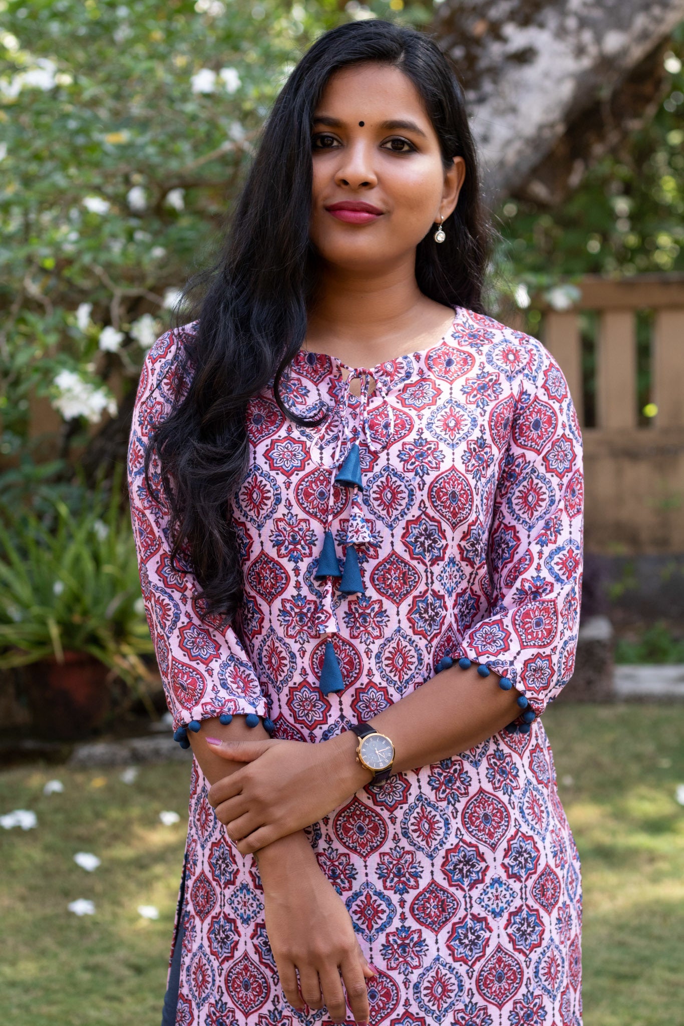 Light pink with blue and maroon cotton-muslin ajrakh print straight cut kurta with dori tie-up neck and round buttons on sleeve ends