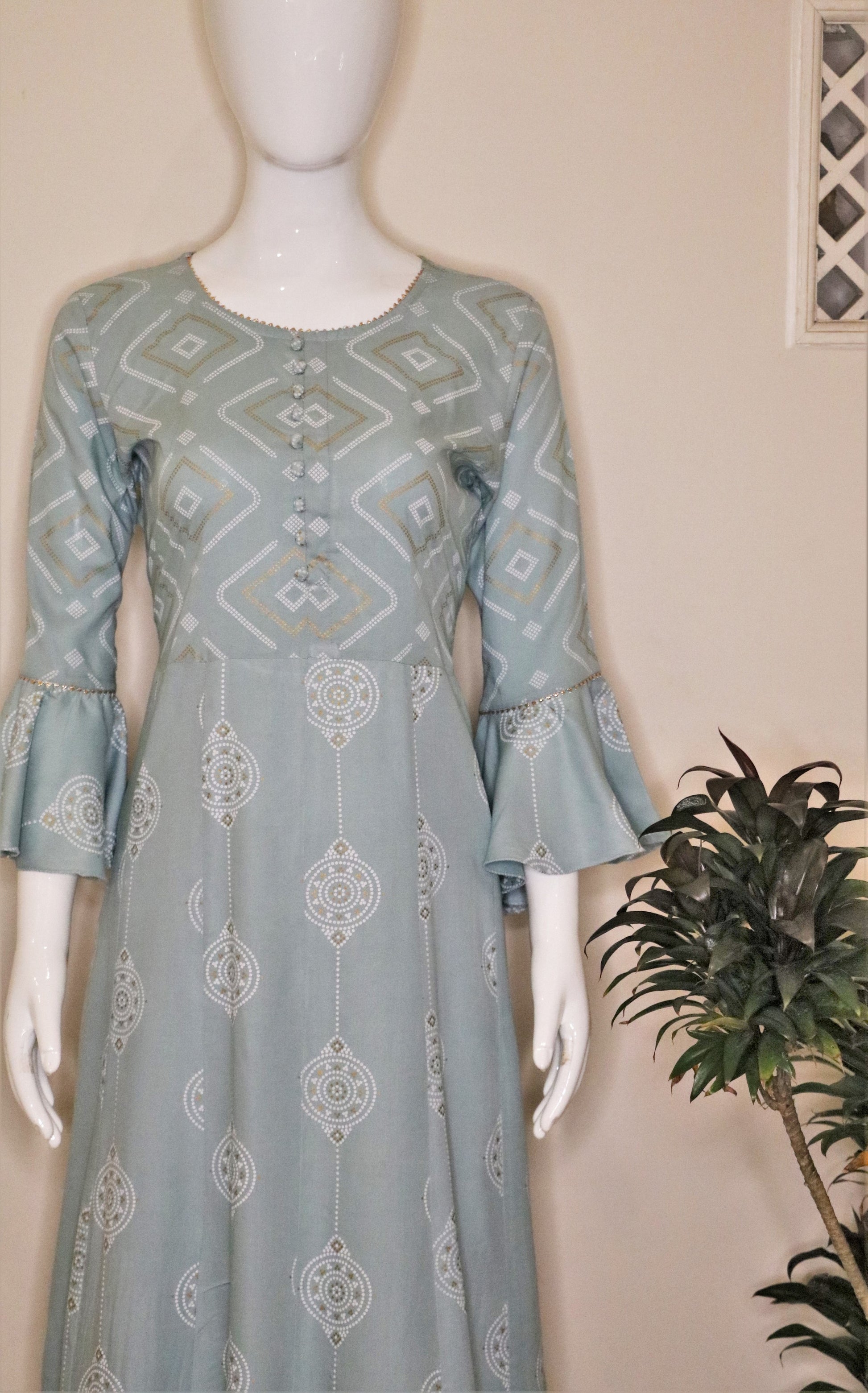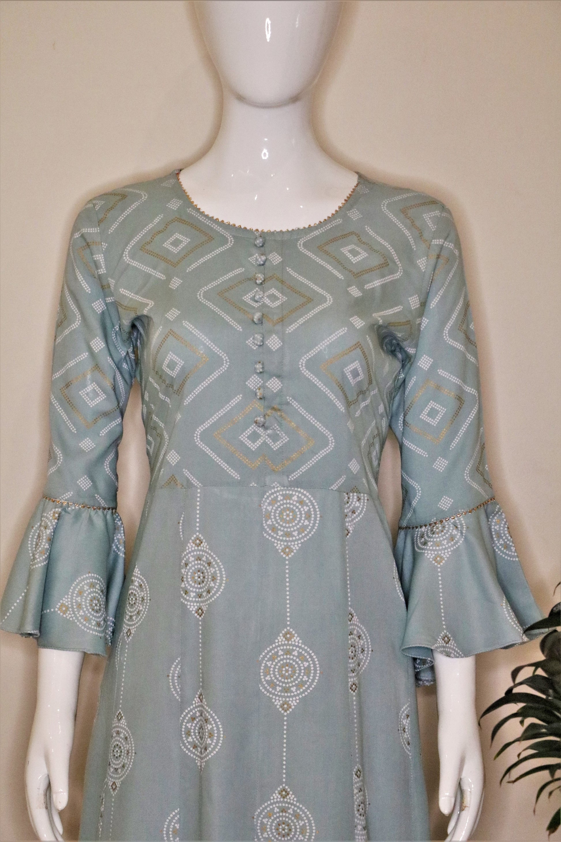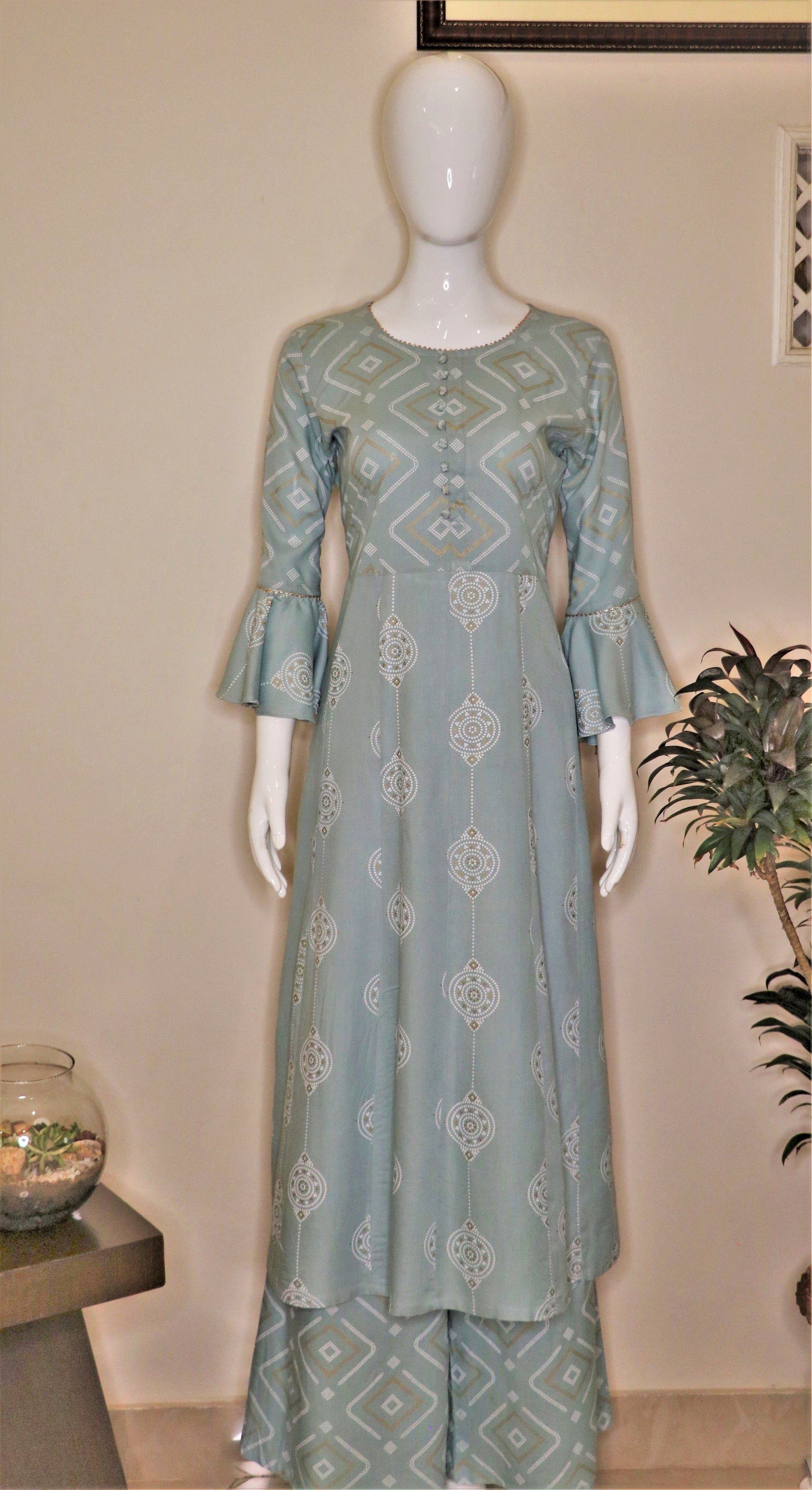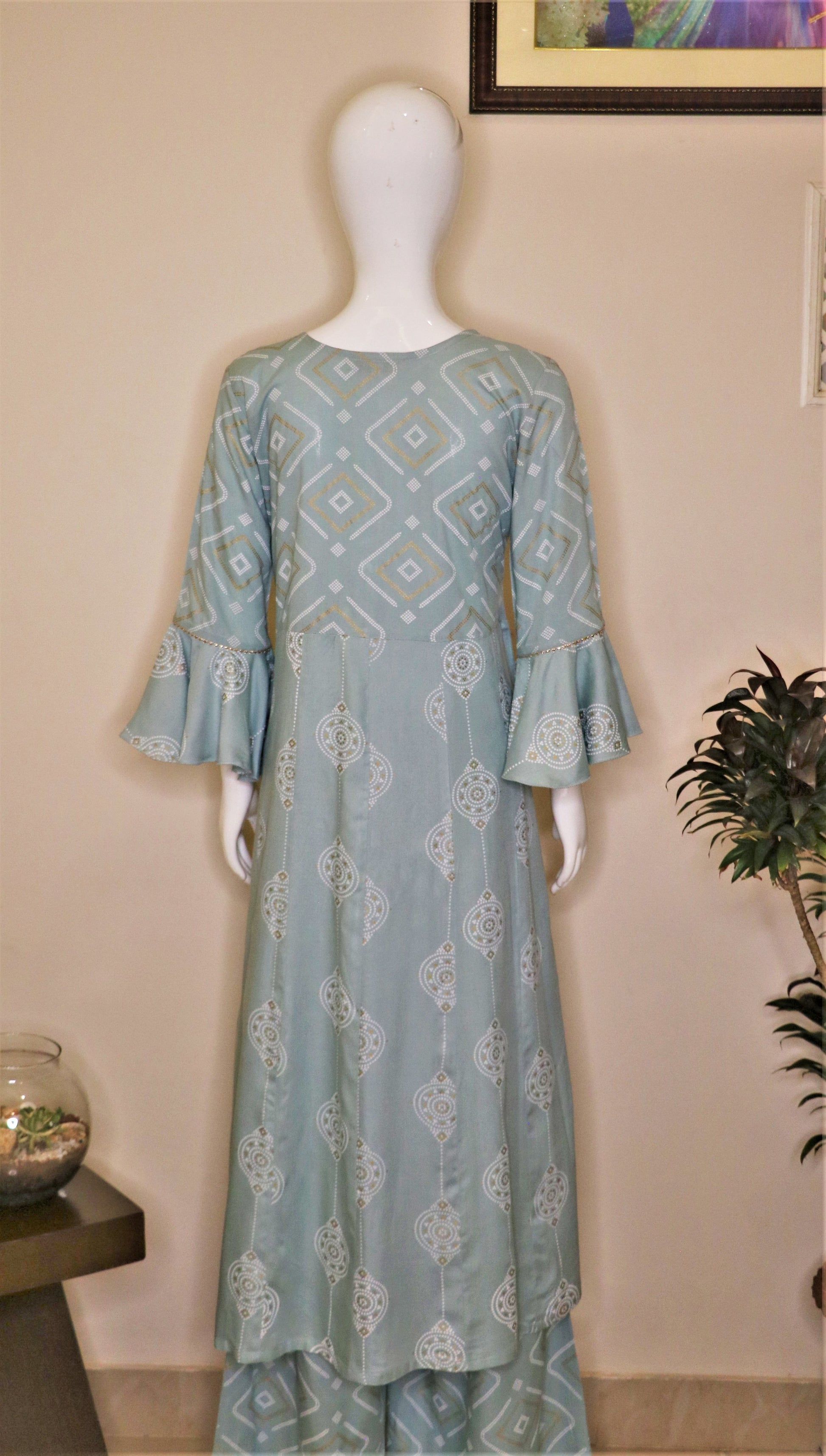 Pastel Green Foil Printed Panel Kurta with bell sleeves & gota lace & flared palazzo pants
