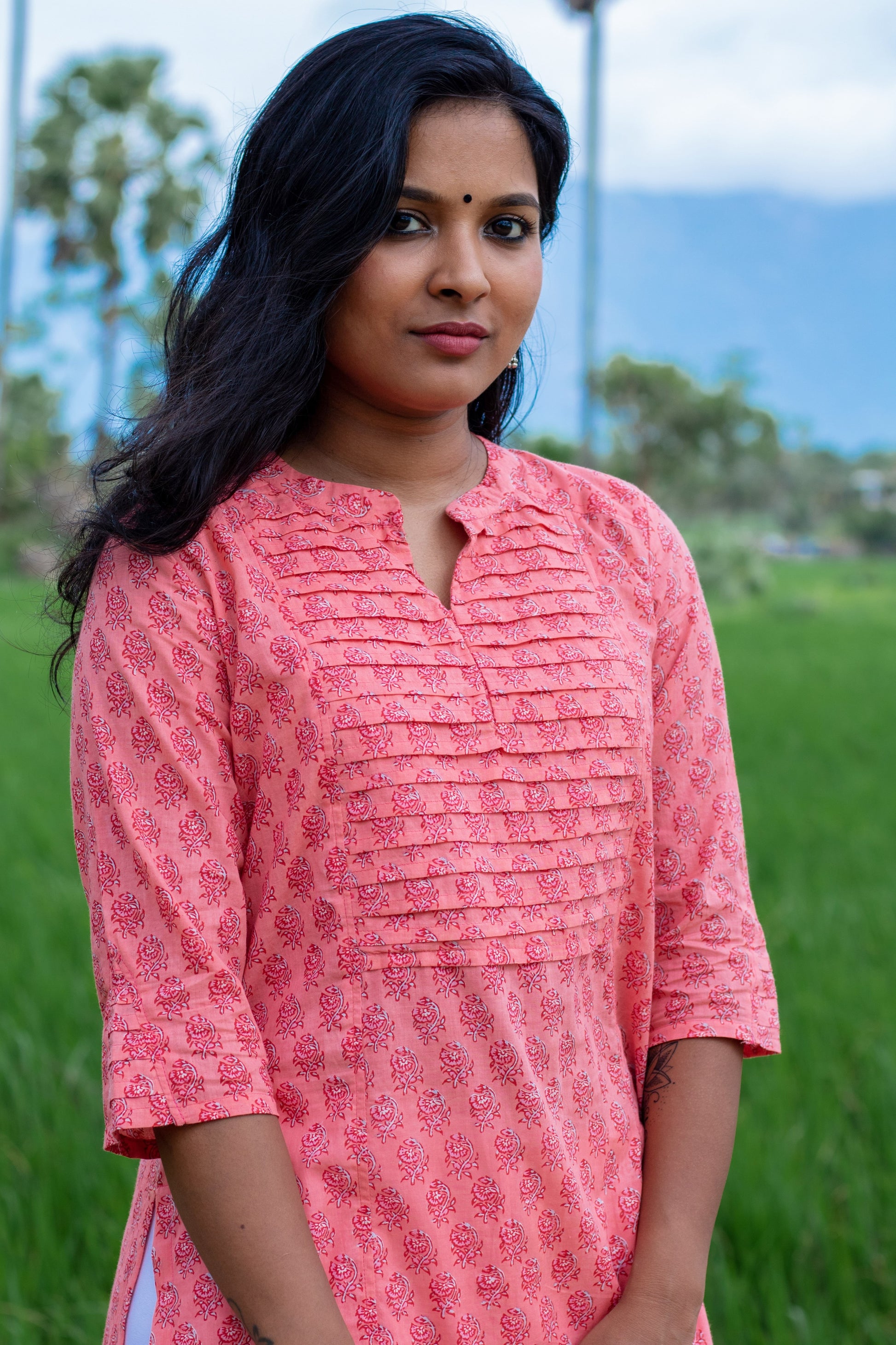 Peach Kurta with Pintucks on the yoke and sleeve ends
