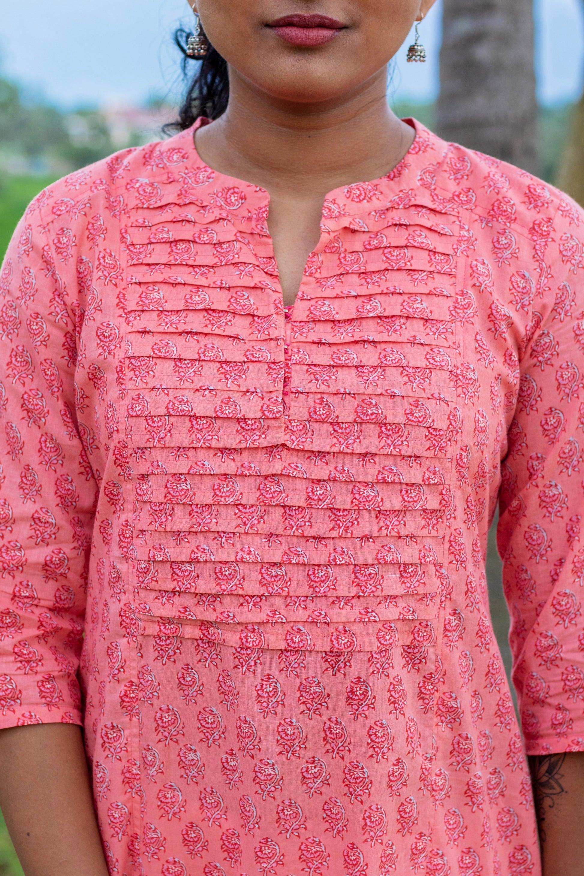 Peach Block Printed Pintuck Kurta