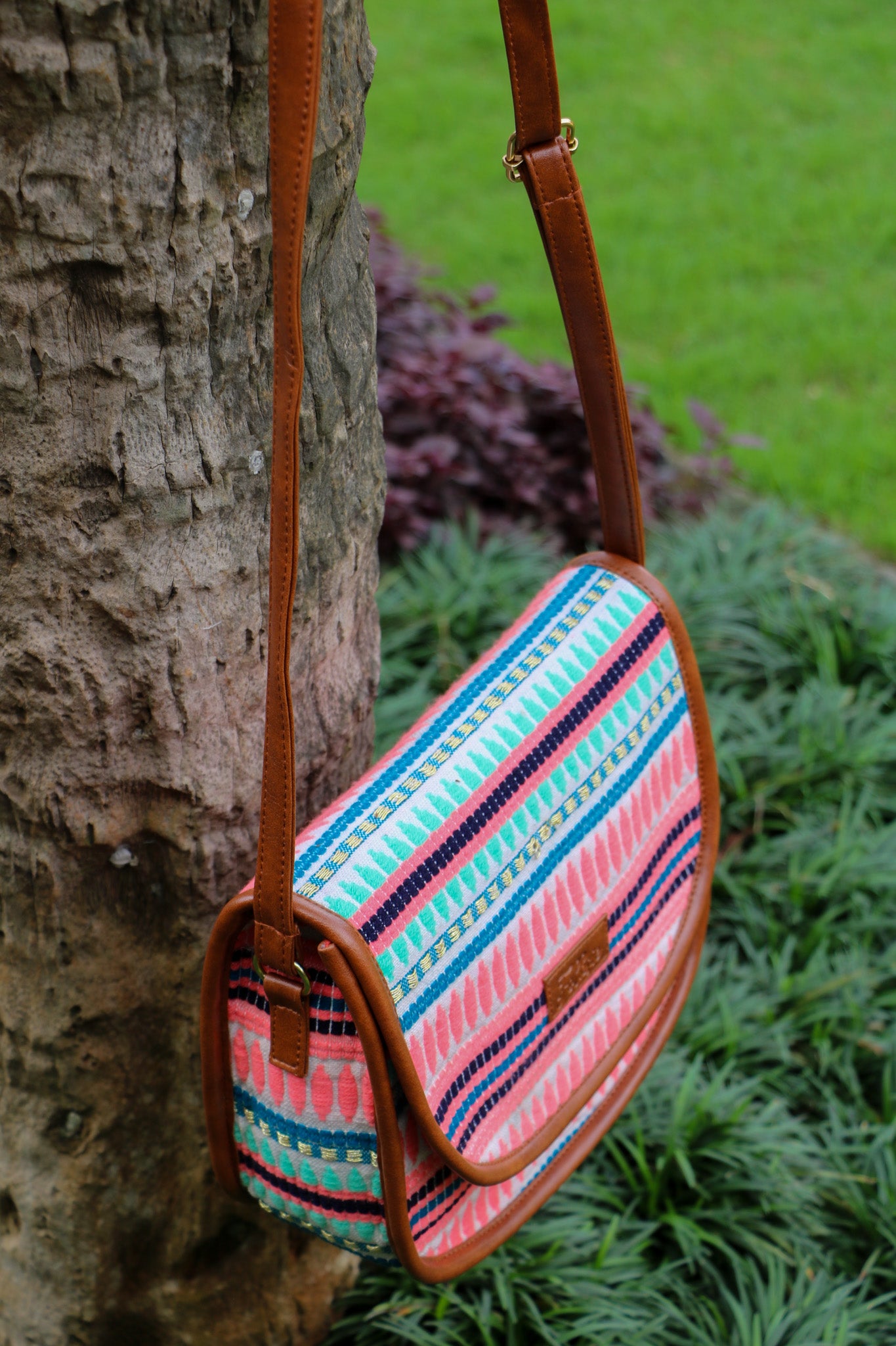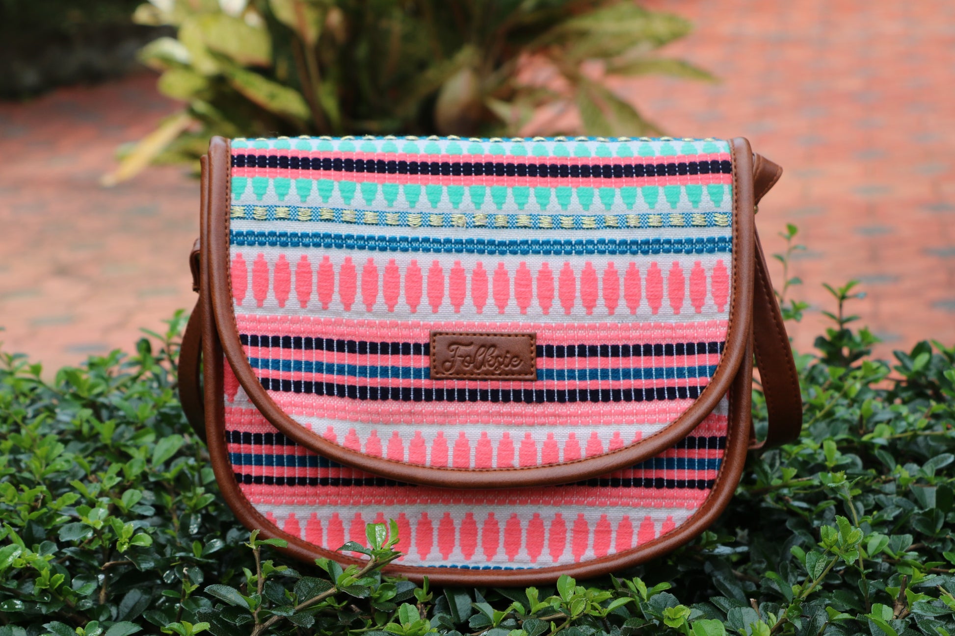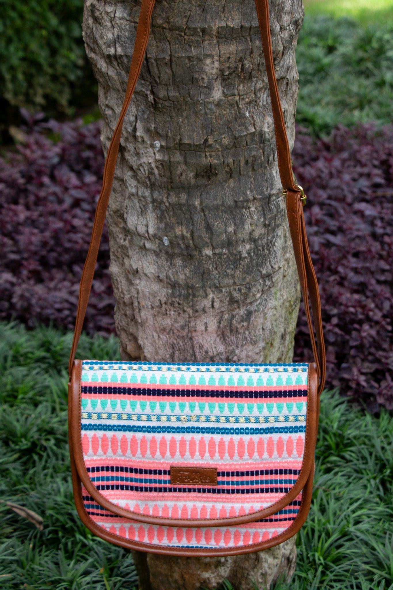 Introducing the Peach Saddle Sling - Handcrafted with vegan leather and cotton jacquard, this bag is perfect daily-use sling bag. It comes with a magnetic closure flap which opens into a spacious compartment to fit your everyday essentials.