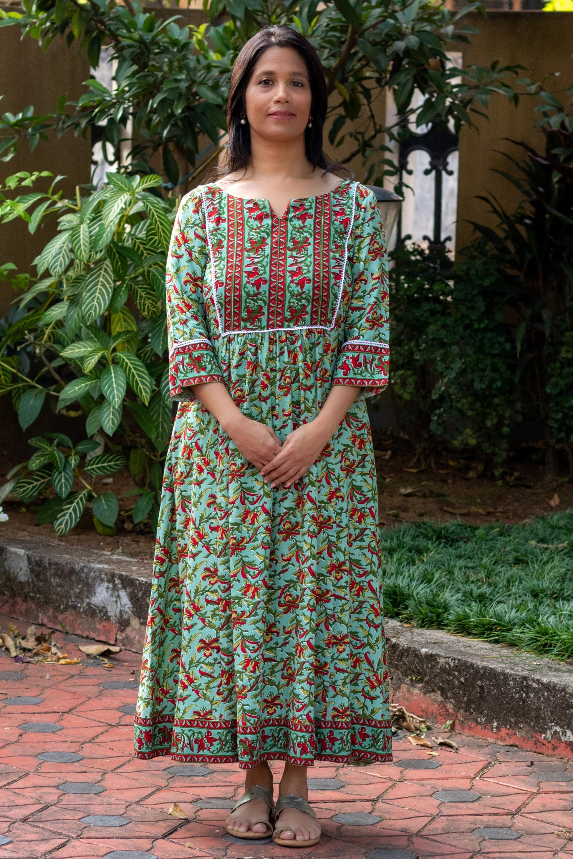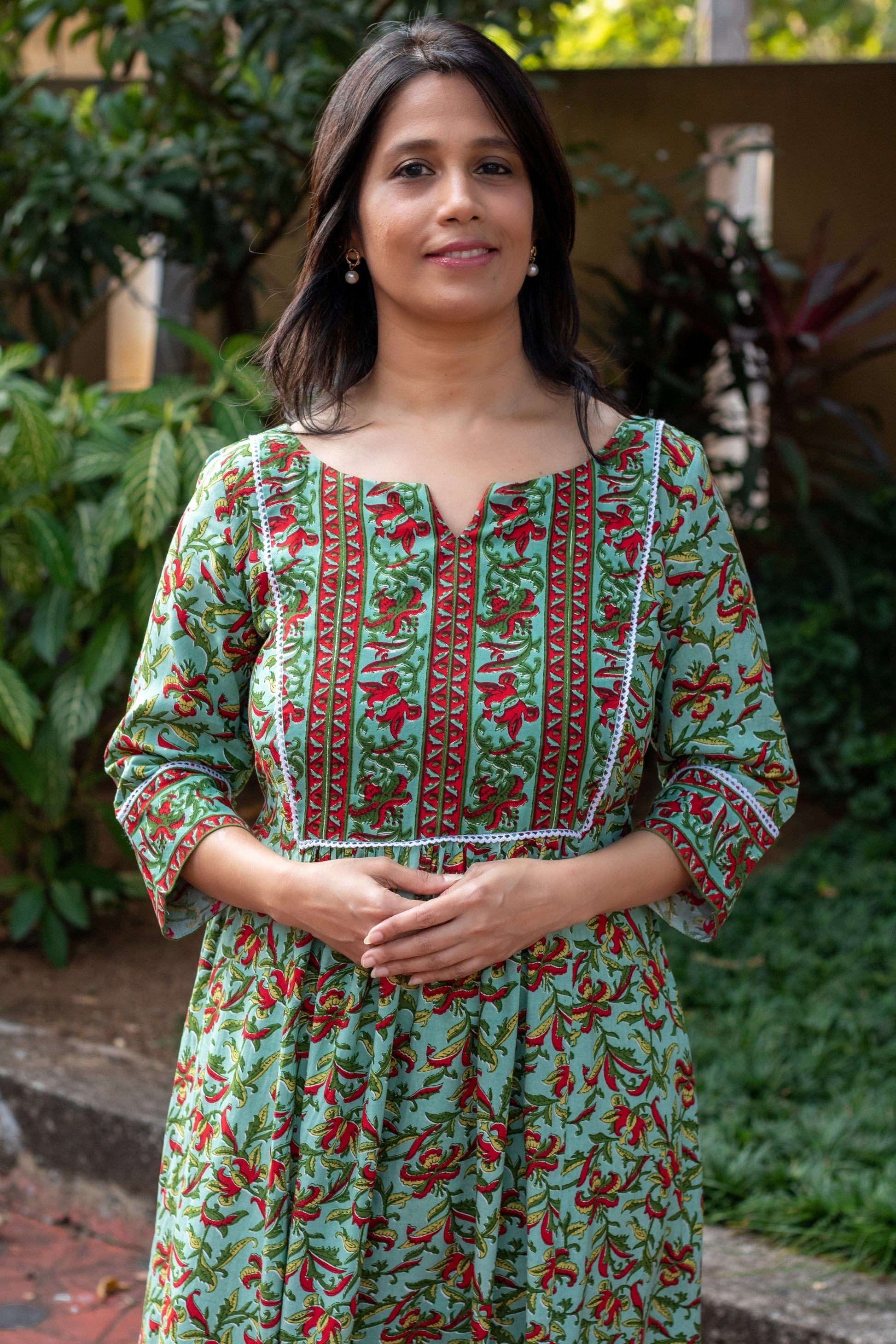 Turquoise & Red with white A Line flared Kurta with mid-ruffles under yoke in the front & back. Wear as a dress or as kurta!