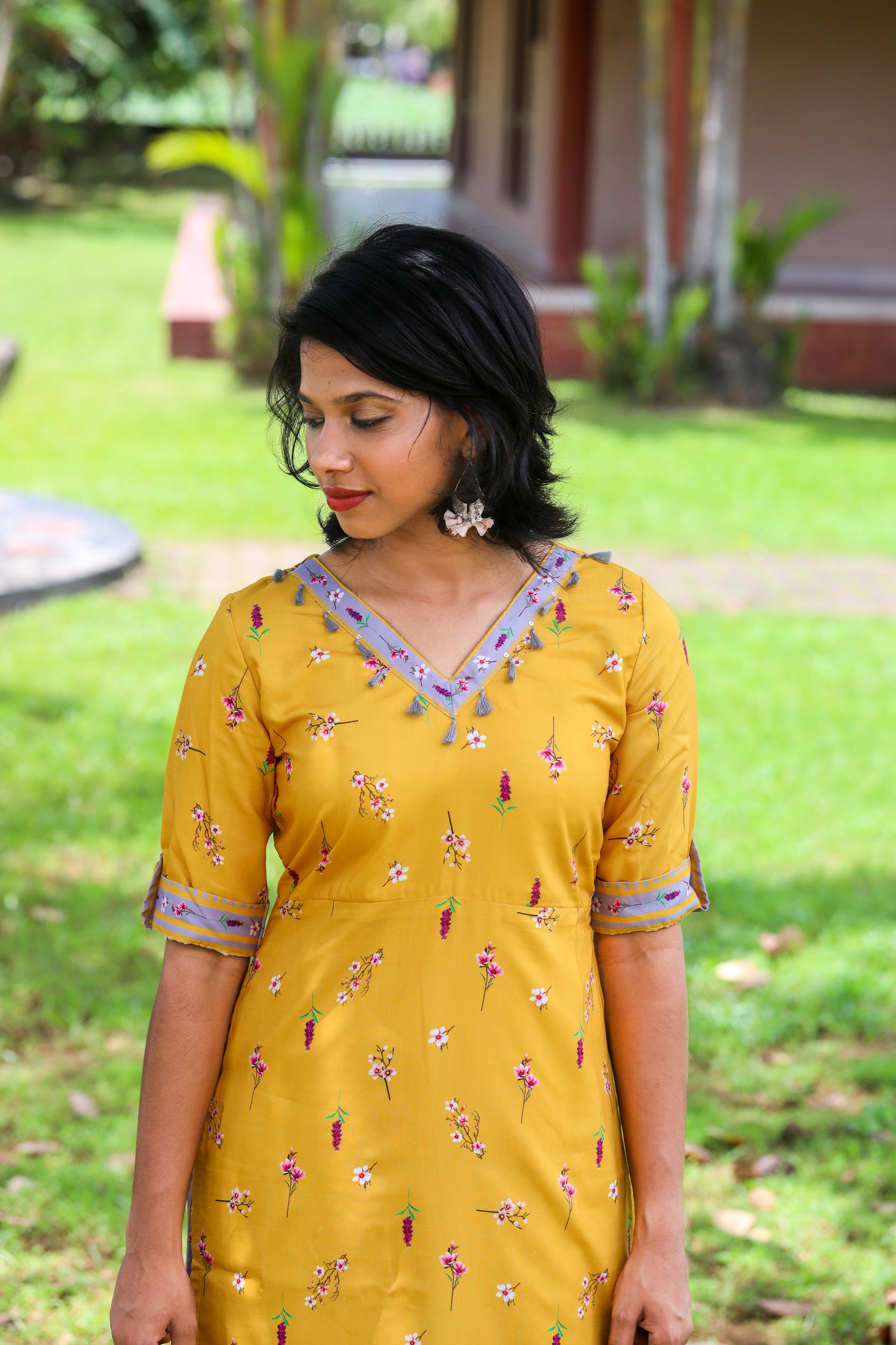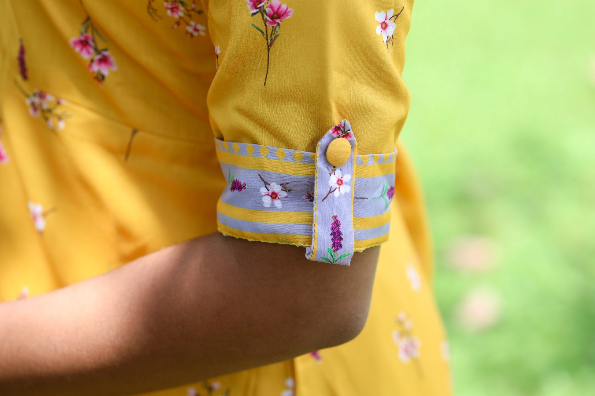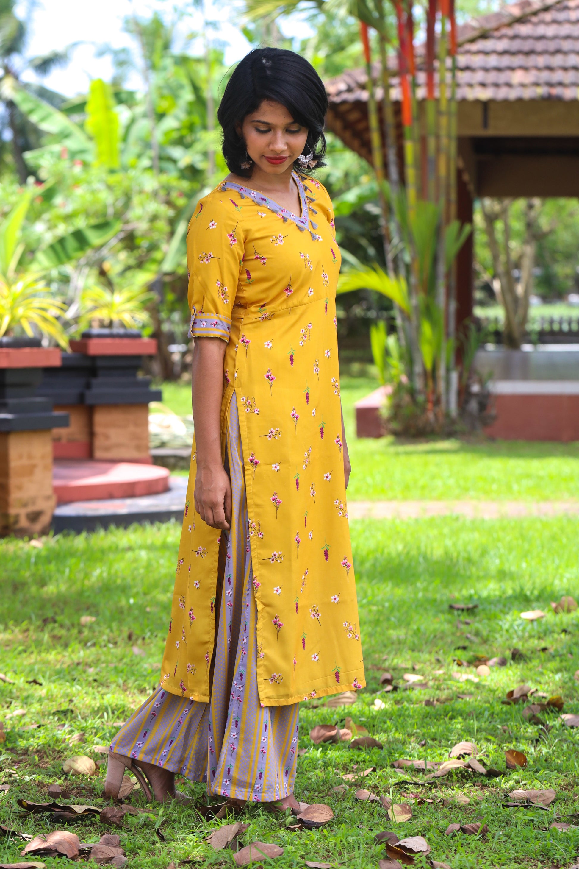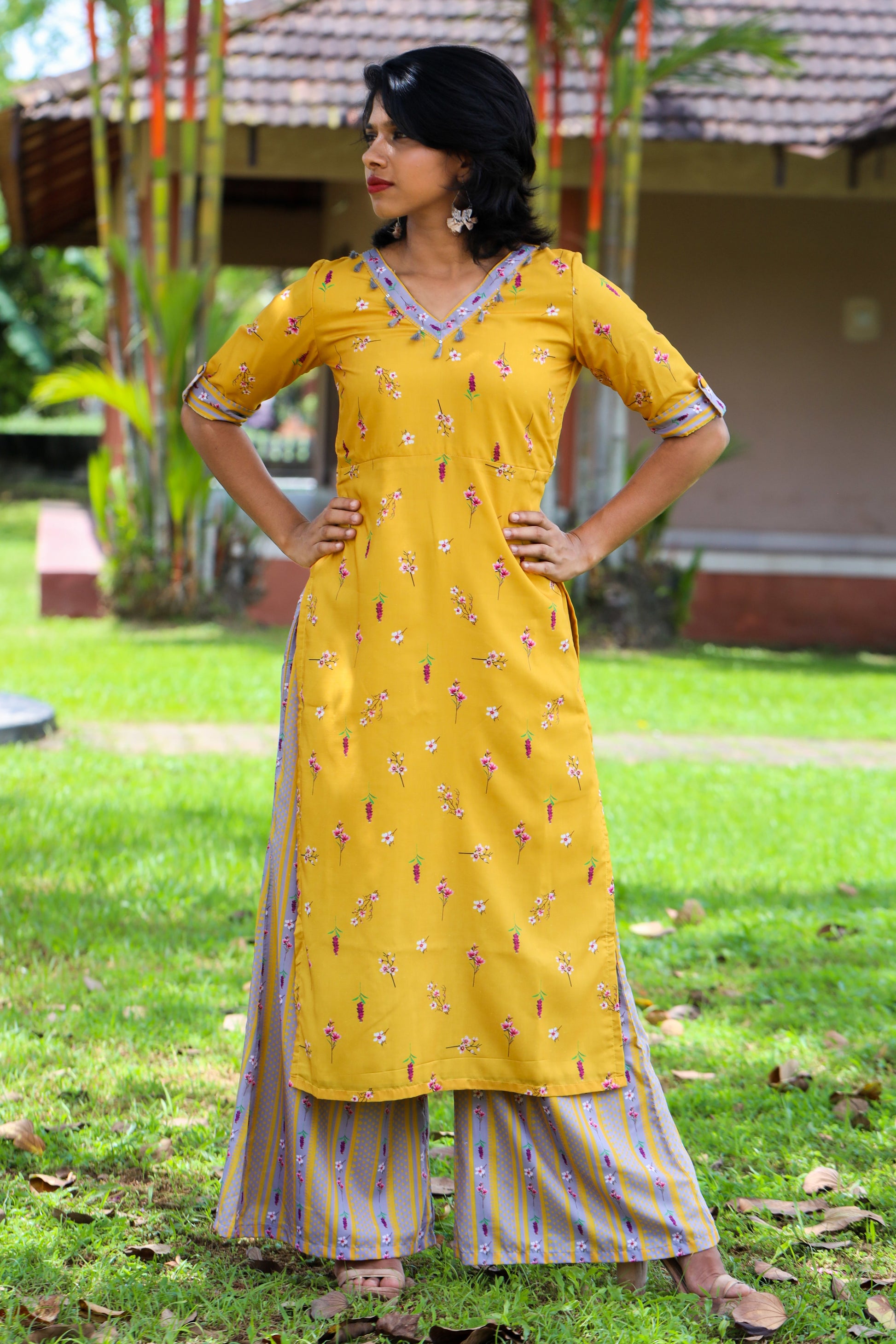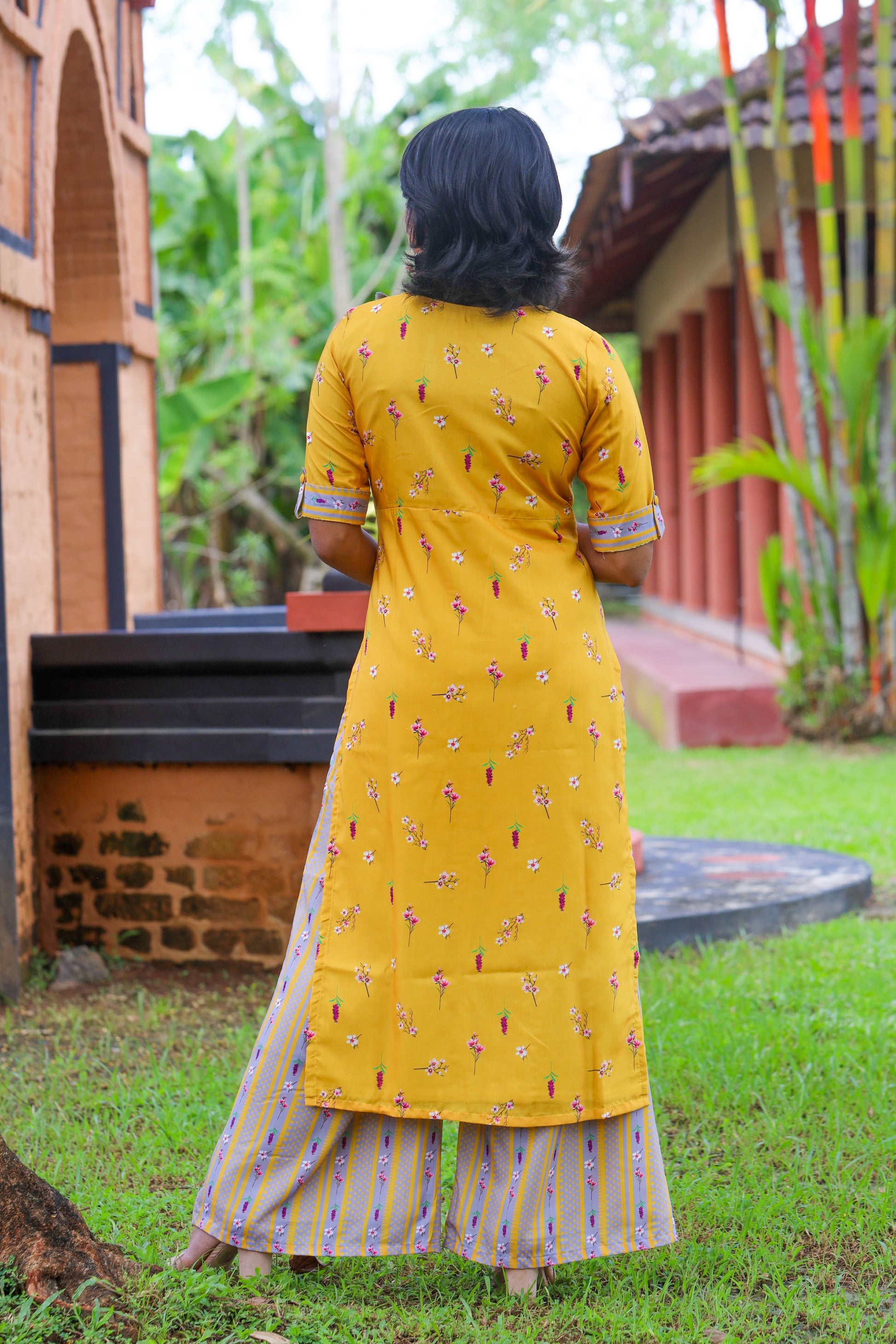 Yellow & Grey Floral Muslin Kurta & Palazzo Set